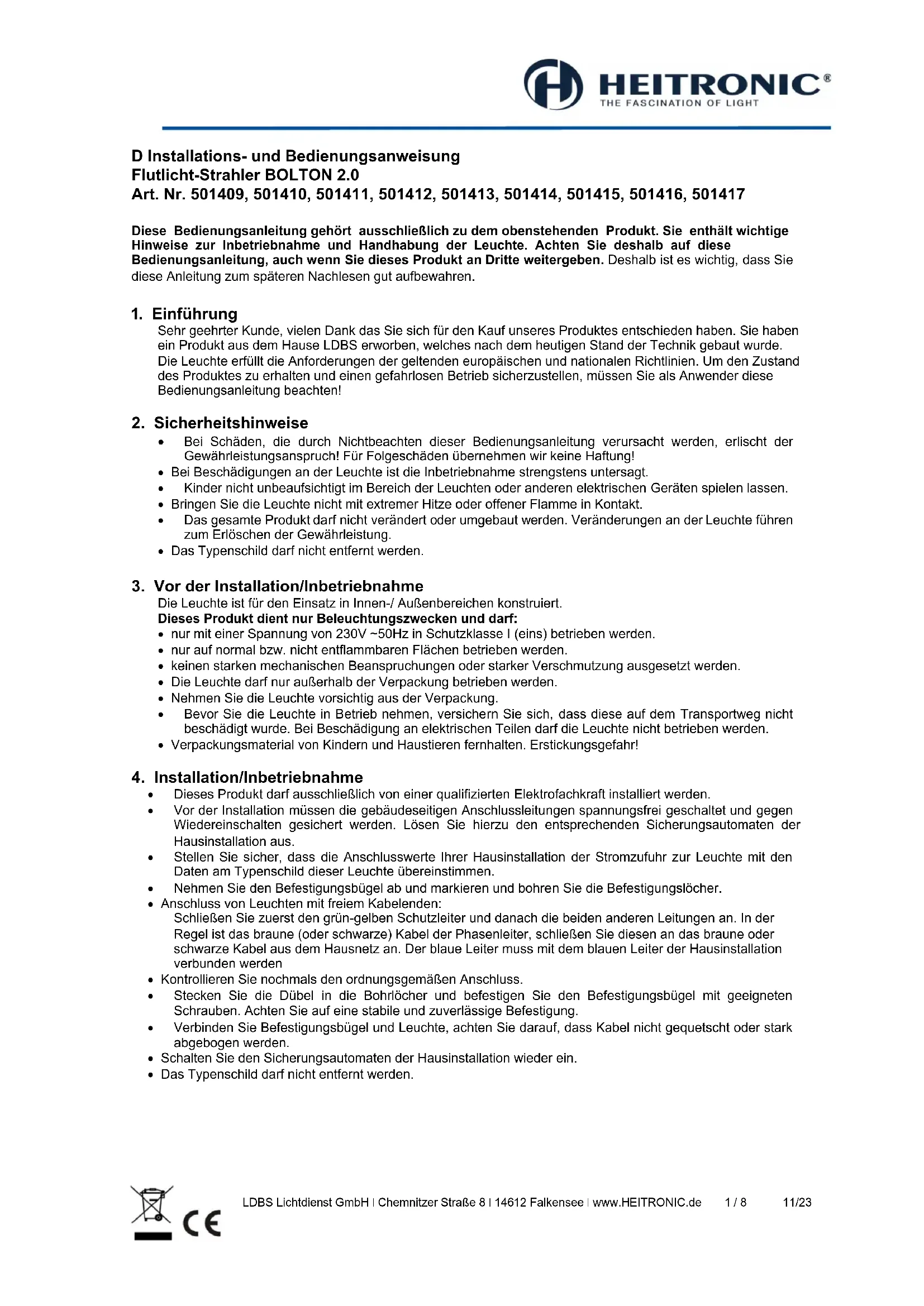 Free cable ends, PIR 230 V ~, 50 Hz 30 W, 2505 lm, 3000 K IP 44 I These products contain an illuminant of energy efficiency class F . Care First disconnect the entire product from the power supply and allow it to cool down before carrying out any cleaning or maintenance work on the product. Clean the product regularly - only with a slightly damp, soft and lint-free cloth... Disposal Waste electronic equipment must be taken to public collection points and must not be disposed of as household waste.LDBS Lichtdienst GmbH ǀ Chemnitzer Straße 8 ǀ 14612 Falkensee ǀ www.HEITRONIC.de 5 / 8 11/23 FR Instructions d'installation et d'utilisation Projecteur BOLTON 2.0 Art. No. 501409, 501410, 501411, 501412, 501413, 501414, 501415, 501416, 501417 Ce mode d'emploi appartient exclusivement au produit susmentionné. Il contient des informations importantes sur la mise en service et la manipulation du luminaire. Veuillez donc prêter attention à ce mode d'emploi, même si vous transmettez ce produit à des tiers. Il est donc important que vous conserviez ce mode d'emploi dans un endroit sûr pour pouvoir le consulter ultérieurement... Introduction Cher client, nous vous remercions d'avoir acheté notre produit. Vous avez acheté un produit de LDBS, qui a été construit selon l'état actuel de la technique. Le luminaire répond aux exigences des directives européennes et nationales en vigueur. Afin de préserver l'état du produit et d'assurer un fonctionnement sûr, vous devez, en tant qu'utilisateur, respecter le présent mode d'emploi ! . Consignes de sécurité En cas de dommages causés par le non-respect de ces instructions d'utilisation, le droit à la garantie s'éteint ! Nous n'assumons aucune responsabilité pour les dommages consécutifs ! Si la lampe est endommagée, il est strictement interdit de la mettre en service. Ne laissez pas les enfants jouer sans surveillance dans la zone des lampes ou d'autres appareils électriques. Pendant le fonctionnement, les LED deviennent chaudes. Le boîtier extérieur de la lampe devient également chaud. Ne mettez pas le luminaire en contact avec une chaleur extrême ou une flamme nue. Ne pas modifier ou altérer l'ensemble du produit. Toute modification du luminaire annule la garantie. La plaque signalétique ne doit pas être retirée... Avant l'installation/la mise en service Le luminaire est conçu pour une utilisation en intérieur/extérieur. Ce produit sert uniquement à l'éclairage et doit être utilisé : ne peut être utilisé qu'avec une tension de 230V ~50Hz en classe de protection I (un). être utilisé uniquement sur des surfaces normales ou non inflammables. ne pas être soumis à de fortes contraintes mécaniques ou à un fort encrassement. Le luminaire ne doit être utilisé qu'en dehors de son emballage. Retirez avec précaution la lampe de son emballage. Avant de mettre la lampe en service, assurez-vous qu'elle n'a pas été endommagée pendant le transport. Si les pièces électriques sont endommagées, la lampe ne doit pas être utilisée. Tenir le matériel d'emballage hors de portée des enfants et des animaux domestiques. Risque d'étouffement ! . Installation/mise en service Ce produit doit être installé exclusivement par un électricien qualifié. Avant l'installation, les câbles de raccordement côté bâtiment doivent être mis hors tension et protégés contre toute remise en marche. Pour ce faire, déclenchez le disjoncteur correspondant de l'installation domestique. Assurez-vous que les valeurs de raccordement de votre installation domestique de l'alimentation électrique du luminaire correspondent aux données figurant sur la plaque signalétique de ce luminaire. Retirez l'étrier de fixation, marquez et percez les trous de fixation. Raccordement de luminaires avec des extrémités de câble libres : Raccordez d'abord le conducteur de protection vert et jaune, puis les deux autres câbles. En règle générale, le câble marron (ou noir) est le conducteur de phase, connectez-le au câble marron ou noir du réseau domestique. Le conducteur bleu doit être relié au conducteur bleu de l'installation domestique. Contrôlez encore une fois que le raccordement est correct. Insérez les chevilles dans les trous de perçage et fixez l'étrier de fixation avec des vis appropriées. Veillez à ce que la fixation soit stable et fiable. Reliez l'étrier de fixation et le luminaire en veillant à ce que les câbles ne soient pas écrasés ou fortement pliés. Réenclenchez le disjoncteur de l'installation domestique. Ne retirez pas la plaque signalétique.LDBS Lichtdienst GmbH ǀ Chemnitzer Straße 8 ǀ 14612 Falkensee ǀ www.HEITRONIC.de 6 / 8 11/23 . Dysfonctionnements Le luminaire ne s'allume pas Luminaire allumé par l'interrupteur mural ? Vérifier les lignes connectées . Données techniques Article Version Raccordement LED Indice de Protection Classe de Protection