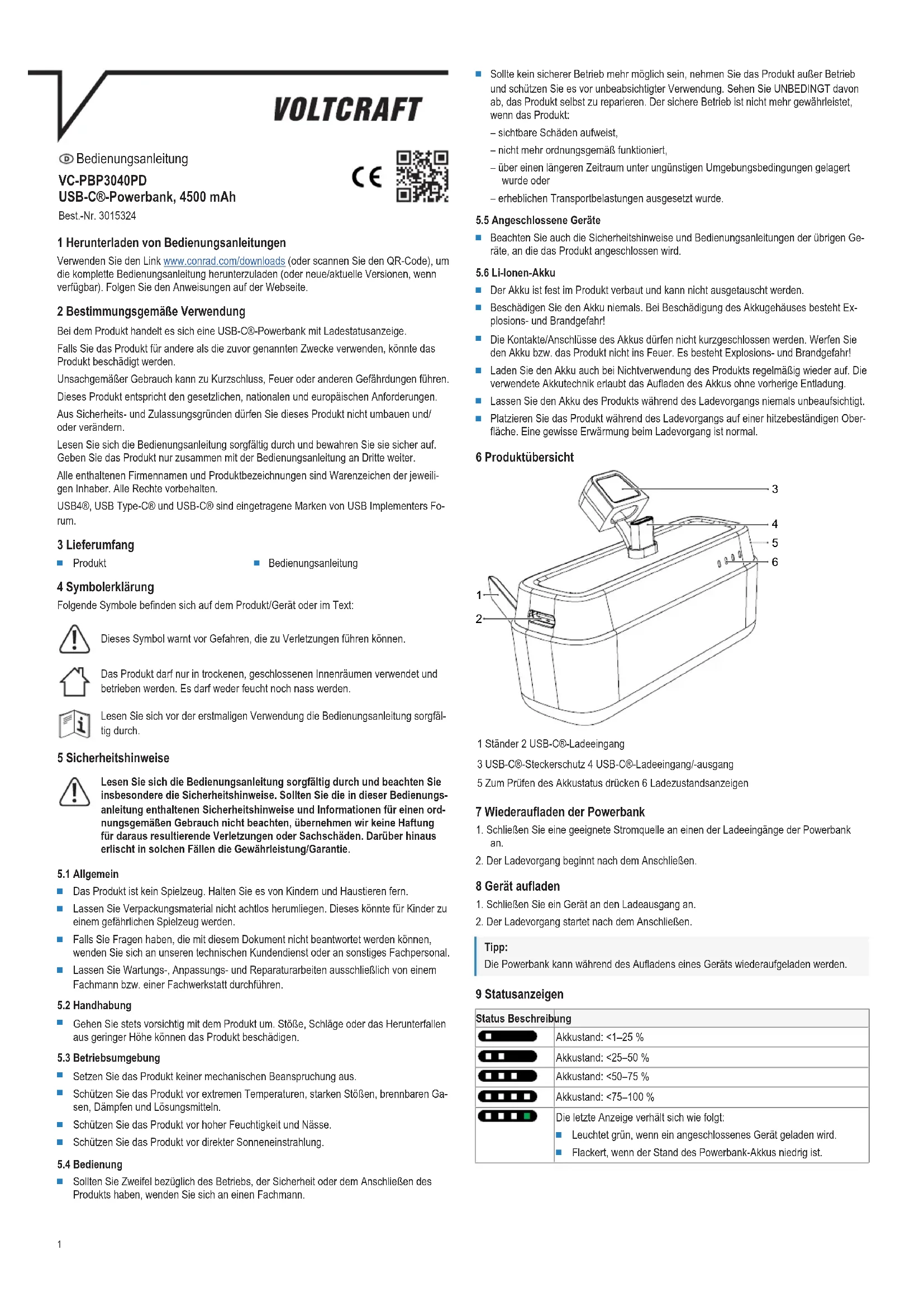 at the collection points of public waste management authorities or the collection points set up by manufacturers or distributors within the meaning of the ElektroG End users are responsible for deleting personal data from the WEEE to be disposed of. It should be noted that different obligations about the return or recycling of WEEE may apply in countries outside of Germany. 12 Technical data Input (USB-C® port)....................... 5 V/DC 2 A, 9 V/DC 2 A (18 W max.) Input (USB-C® plug) ...................... 5 V/DC 2 A, 9 V/DC 2 A (18 W max.) Output (USB-C® plug).................... 5 V/DC 3 A, 9 V/DC 2.22 A, 12 V/DC 1.67 A (20 W max.) Rechargeable battery ..................... 3.7 V 4500 mAh Li-ion type 21700 Charging duration........................... approx. 2 hrs 15 mins Operating temperature .................. 0 to +45 °C Operating humidity ........................ 20 - 90 % RH (non-condensing) Storage temperature ...................... -10 to +45 °C Storage humidity ............................ 20 - 90 % RH (non-condensing) Dimensions (L x W x H) (approx.) . 81 x 35 x 28 mm Weight (approx.) ............................ 105 g This is a publication by Conrad Electronic SE, Klaus-Conrad-Str. 1, D-92240 Hirschau (www.conrad.com). All rights including translation reserved. Reproduction by any method (e.g. photocopying, microfilming or the capture in electronic data processing systems) requires prior written approval from the editor. Reprinting, also in part, is prohibited. This publication reflects the technical status at the time of printing. Copyright by Conrad Electronic SE. *3015324_V1_0324_dh_mh_en 1238677131-2 I1/O1 en5 Mode d’emploi VC-PBP3040PD Batterie externe USB-C®, 4500mAh N° de commande 3015324 1 Mode d'emploi à télécharger Utilisez le lien www.conrad.com/downloads (ou scannez le code QR) pour télécharger le mode d'emploi complet (ou les versions nouvelles/actuelles, le cas échéant). Respectez les instructions indiquées sur la page Web. 2 Utilisation prévue Le produit est une batterie externe USB-C® avec des indicateurs d’état de charge. Toute utilisation à des fins autres que celles décrites pourrait endommager le produit. Une mauvaise utilisation peut entraîner des risques tels que des courts-circuits, des incen- dies, etc. Ce produit est conforme aux exigences nationales et européennes en vigueur. Pour des raisons de sécurité et d’homologation, toute restructuration et/ou modification du produit est interdite. Lisez attentivement les instructions du mode d’emploi et conservez-le dans un endroit sûr. Ne mettez ce produit à la disposition de tiers qu’avec son mode d’emploi. Tous les noms d’entreprises et appellations de produits sont des marques commerciales de leurs propriétaires respectifs. Tous droits réservés. USB4®, USB Type-C® et USB-C® sont des marques déposées de l'USB Implementers Fo- rum. 3 Contenu de l'emballage