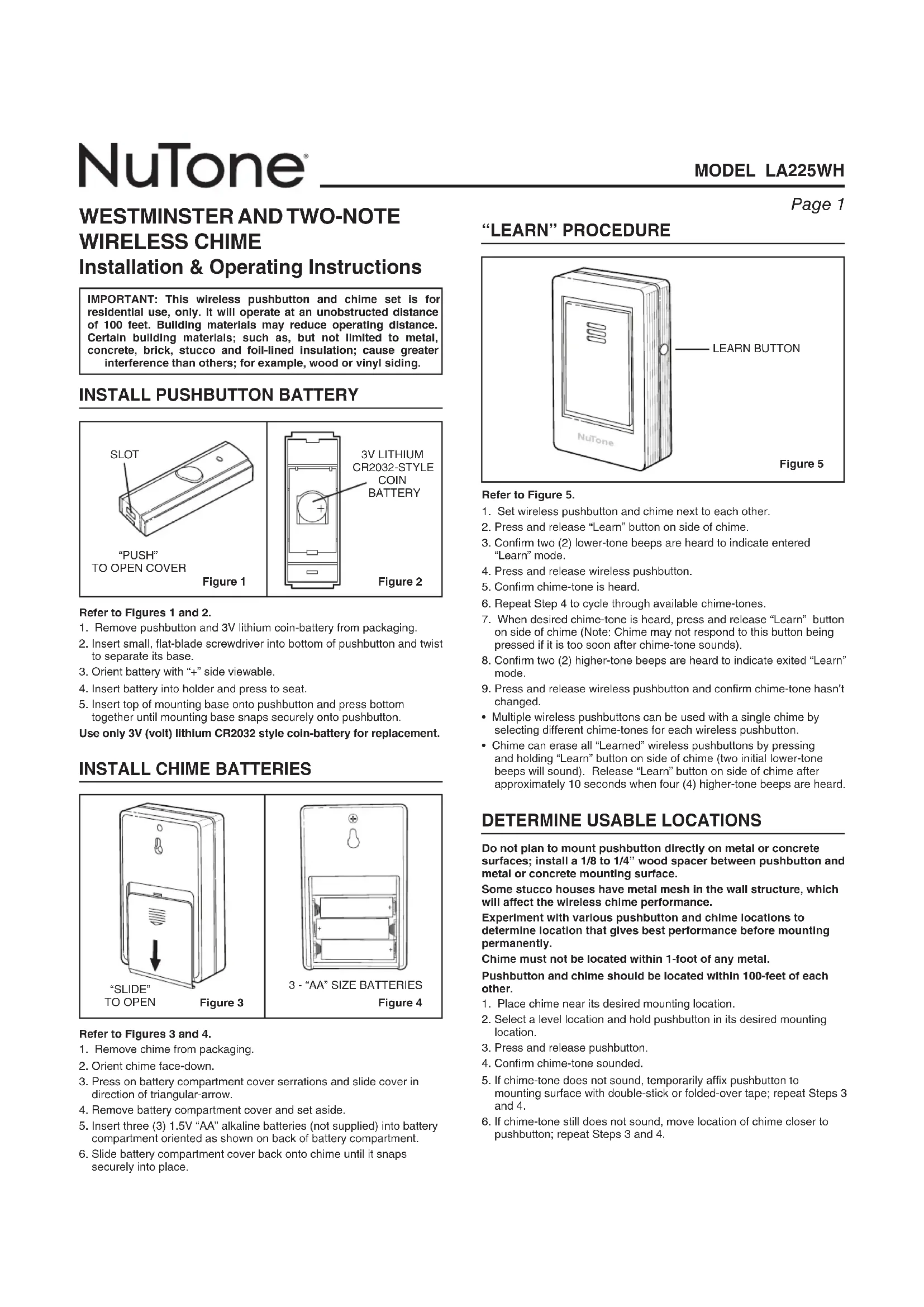 LA225WH - Sonnette de portes NuTone - Notice d'utilisation et mode d'emploi gratuit