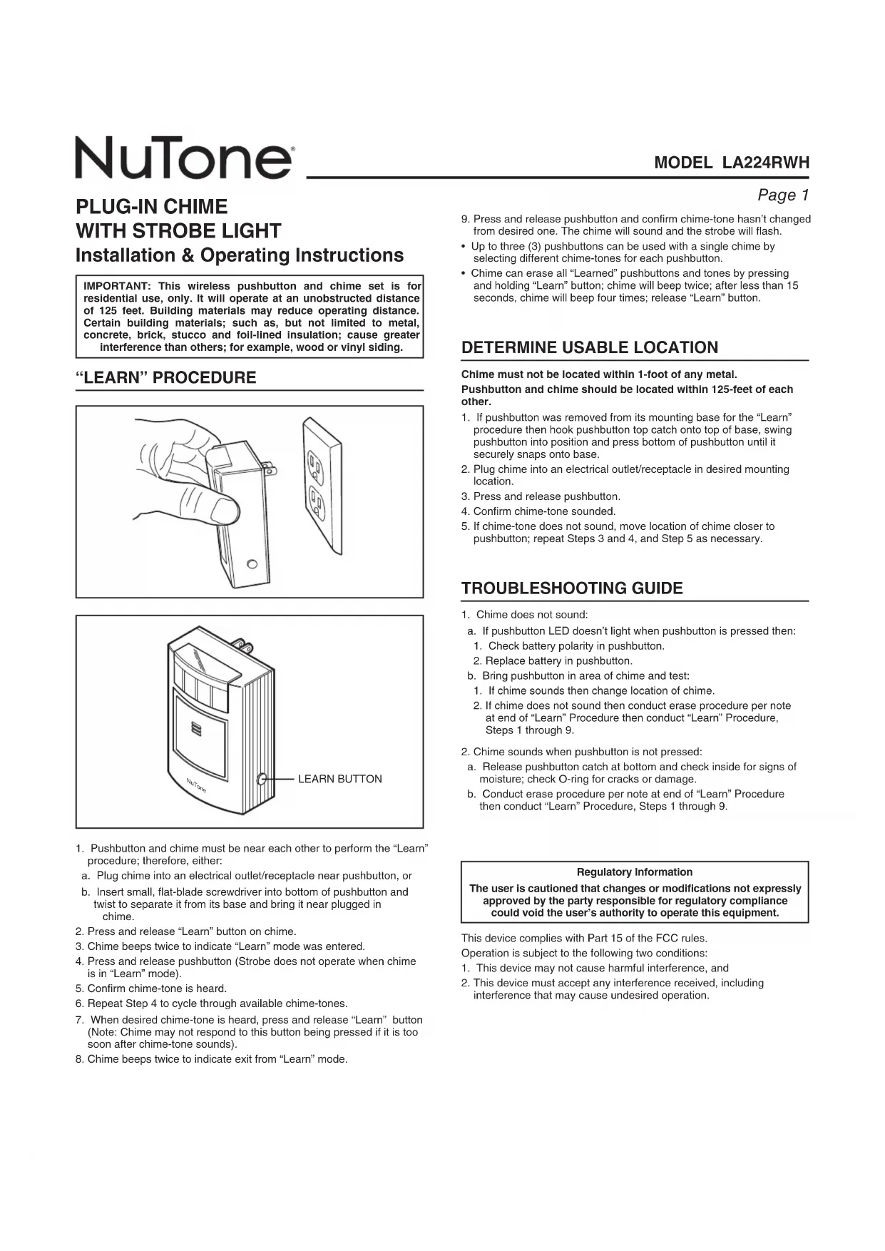 Retrouvez gratuitement la notice de l'appareil LA224RWH NuTone au format PDF.