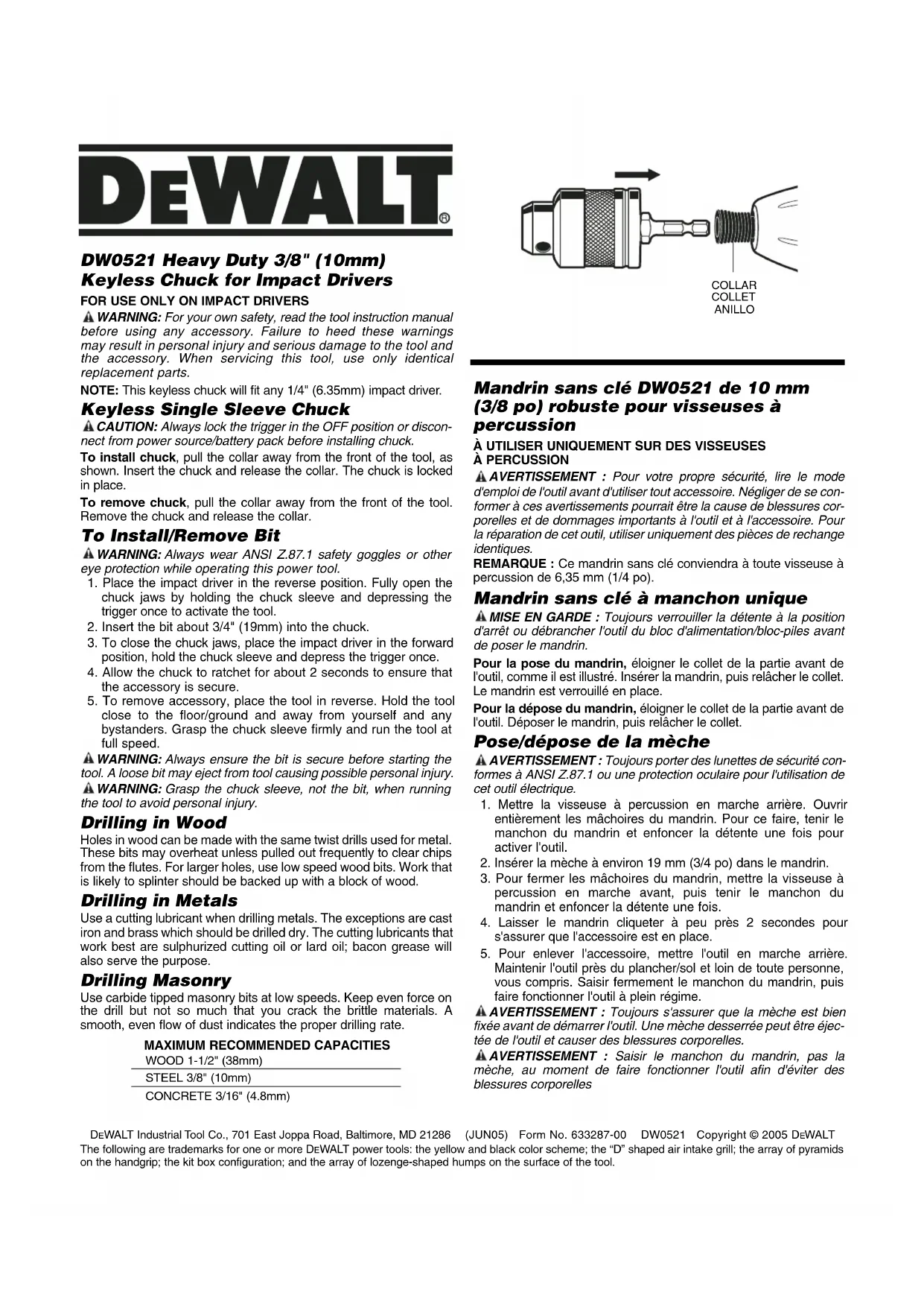 d'emploi de l'outil avant d'utiliser tout accessoire. Négliger de se con- former à ces avertissements pourrait être la cause de blessures cor- porelles et de dommages importants à l'outil et à l'accessoire. Pour la réparation de cet outil, utiliser uniquement des pièces de rechange identiques. REMARQUE : Ce mandrin sans clé conviendra à toute visseuse à percussion de 6,35 mm (1/4 po). Mandrin sans clé à manchon unique MISE EN GARDE : Toujours verrouiller la détente à la position d'arrêt ou débrancher l'outil du bloc d'alimentation/bloc-piles avant de poser le mandrin. Pour la pose du mandrin, éloigner le collet de la partie avant de l'outil, comme il est illustré. Insérer la mandrin, puis relâcher le collet. Le mandrin est verrouillé en place. Pour la dépose du mandrin, éloigner le collet de la partie avant de l'outil. Déposer le mandrin, puis relâcher le collet. Pose/dépose de la mèche