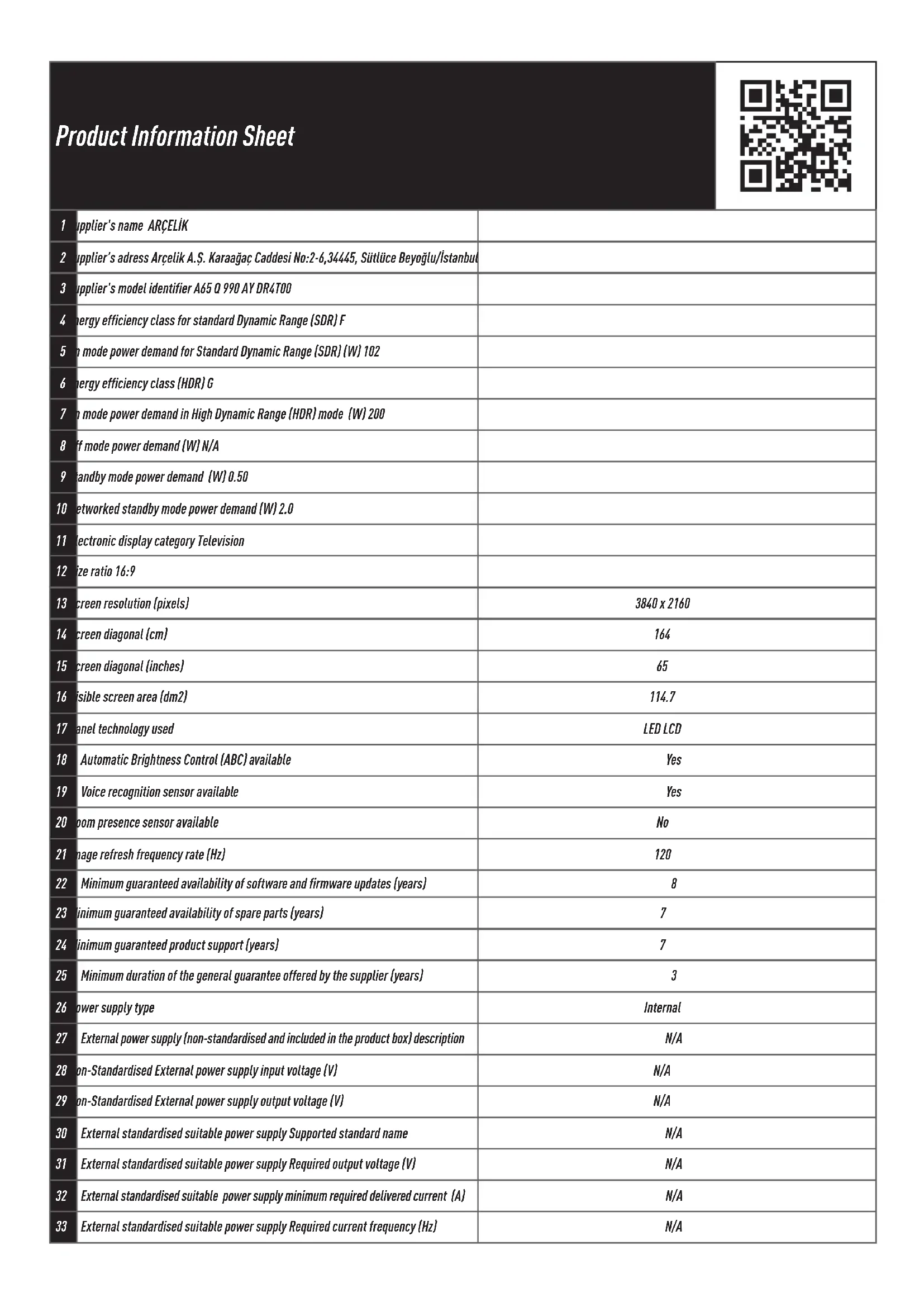 A65 Q 990 AY - Téléviseur Arçelik - Notice d'utilisation et mode d'emploi gratuit