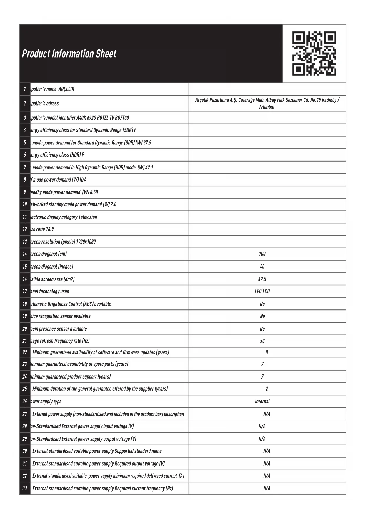Retrouvez gratuitement la notice de l'appareil A40K 692G Arçelik au format PDF.