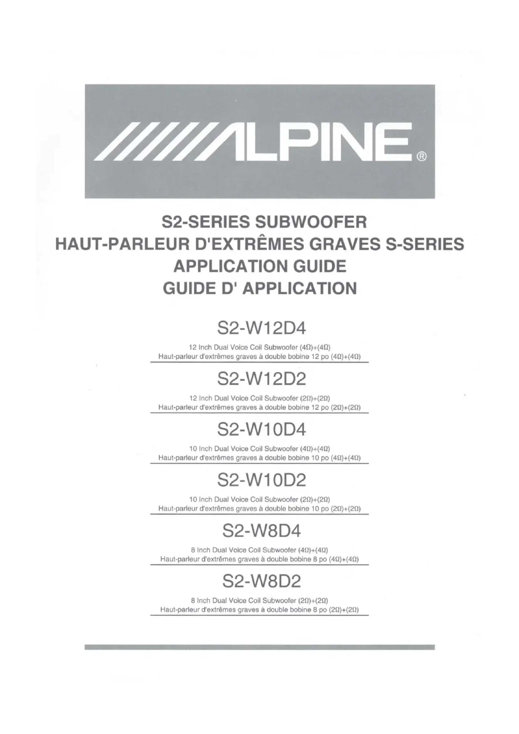 Téléchargez la notice de votre Caisson de basses au format PDF gratuitement ! Retrouvez votre notice S2-W12D4 - ALPINE et reprennez votre appareil électronique en main. Sur cette page sont publiés tous les documents nécessaires à l'utilisation de votre appareil S2-W12D4 de la marque ALPINE.