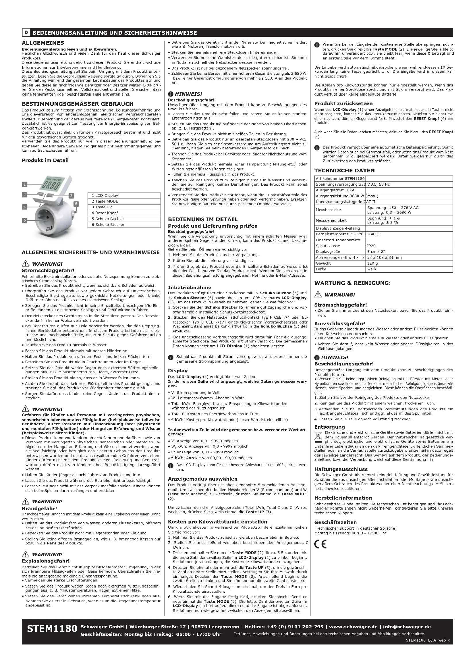 STEM1180 - Compteur d'énergie Schwaiger - Notice d'utilisation et mode d'emploi gratuit