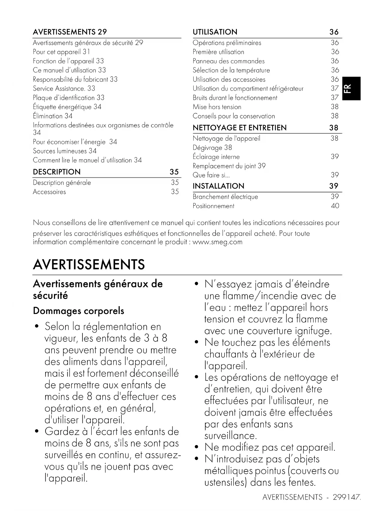 Nettoyage de l'appareil 38Dégivrage 38Éclairage interne 39Remplacement du joint 39Que faire si... 39 INSTALLATION 39 Branchement électrique 39Positionnement 40 Nous conseillons de lire attentivement ce manuel qui contient toutes les indications nécessaires pour préserver les caractéristiques esthétiques et fonctionnelles de l’appareil acheté. Pour toute information complémentaire concernant le produit : www.smeg.com AVERTISSEMENTS Avertissements généraux de sécurité Dommages corporels