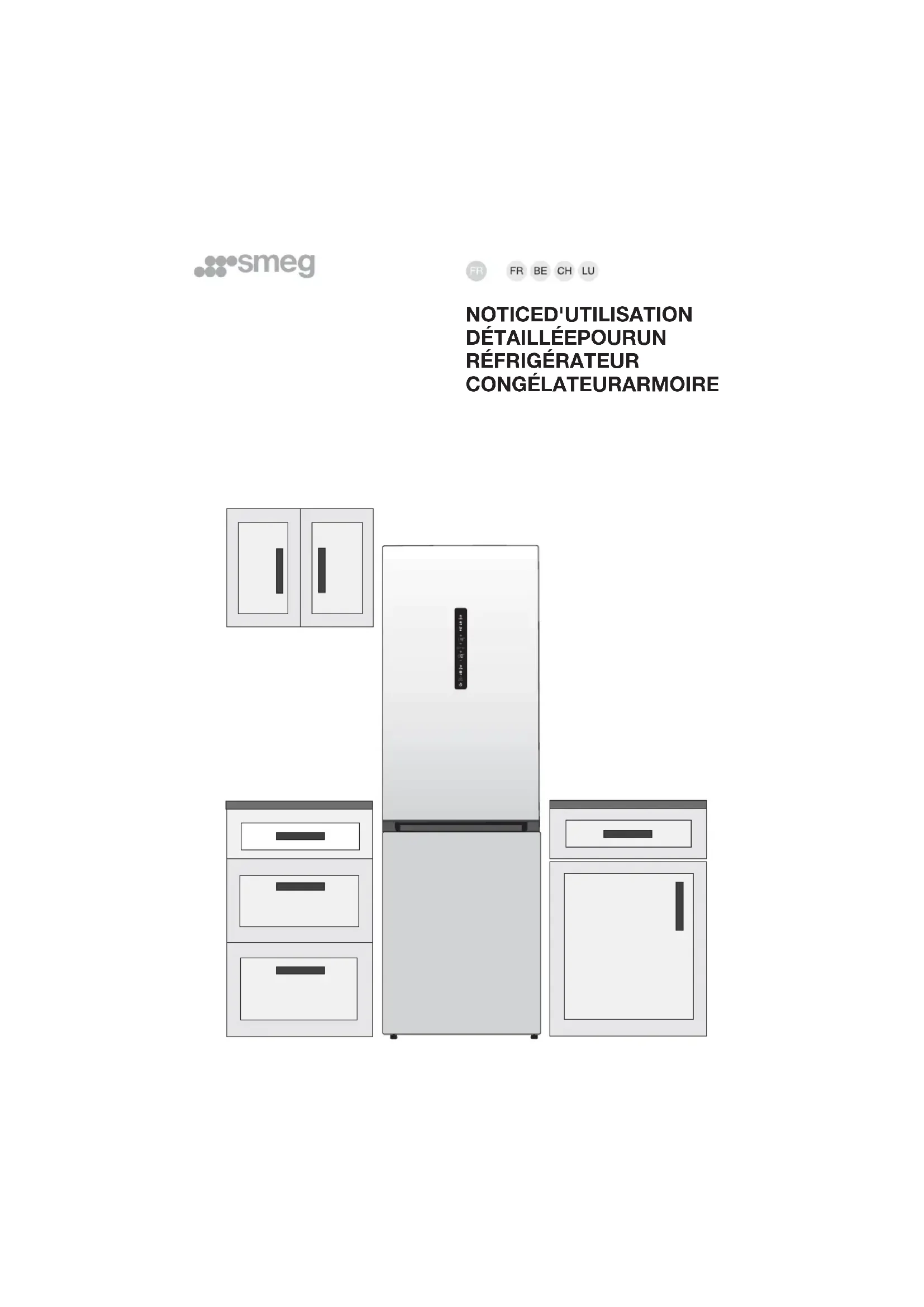 - CONGÉLATEUR ARMOIRENous vous remercions vivement de la confiance que vous nous avez manifestée en achetant un appareil de notre marque, conçu pour vous simplifier la vie. Afin de vous faciliter l'utilisation de ce produit, nous vous fournissons un mode d'emploi détaillé et une notice d'installation séparée. Ces instructions vous permettront de vous familiariser rapidement avec votre nouvel appareil. Nous vous souhaitons beaucoup de plaisir lors de son utilisation. Visitez notre site Web : Vous obtiendrez des conseils d'utilisation, des brochures et des informations sur les dépannages, le service après-vente et les réparations : www.smeg.com/services/customer-service Sous réserve de modifications sans préavis. Lien vers la base de données européenne sur l’étiquetage énergétique (EPREL) de l’UE Le code QR figurant sur l’étiquette énergétique fournie avec l’appareil fournit un lien internet vers l’enregistrement de cet appareil dans la base de données EPREL de l’UE. Conservez l’étiquette énergétique à titre de référence, ainsi que le mode d’emploi et tous les autres documents fournis avec l’appareil. Il est possible de trouver des informations relatives aux performances du produit dans la base de données EU EPREL en utilisant le lien https://eprel.ec.europa.eu et le nom du modèle et le numéro du produit que vous pouvez trouver sur la plaque signalétique de l’appareil. Pour des informations plus détaillées sur l’étiquette énergétique, consultez le site www.theenergylabel.eu. L'appareil est destiné exclusivement à un usage ménager. Le réfrigérateur est prévu pour la conservation des aliments frais à une température supérieure à 0°C. Le congélateur est destiné à la congélation des aliments frais et à la conservation à long terme des surgelés (jusqu’à un an, selon la nature des produits). Les pictogrammes figurant dans cette notice ont les significations suivantes : INFORMATION Informations, conseils, astuces, ou recommandations ATTENTION ! Attention – danger RISQUE DE CHOC ÉLECTRIQUE ! Attention – risque de choc électrique RISQUE D'INCENDIE ! Attention – risque d'incendieTables des matières 5Recommandations importantes et précautions p. 5