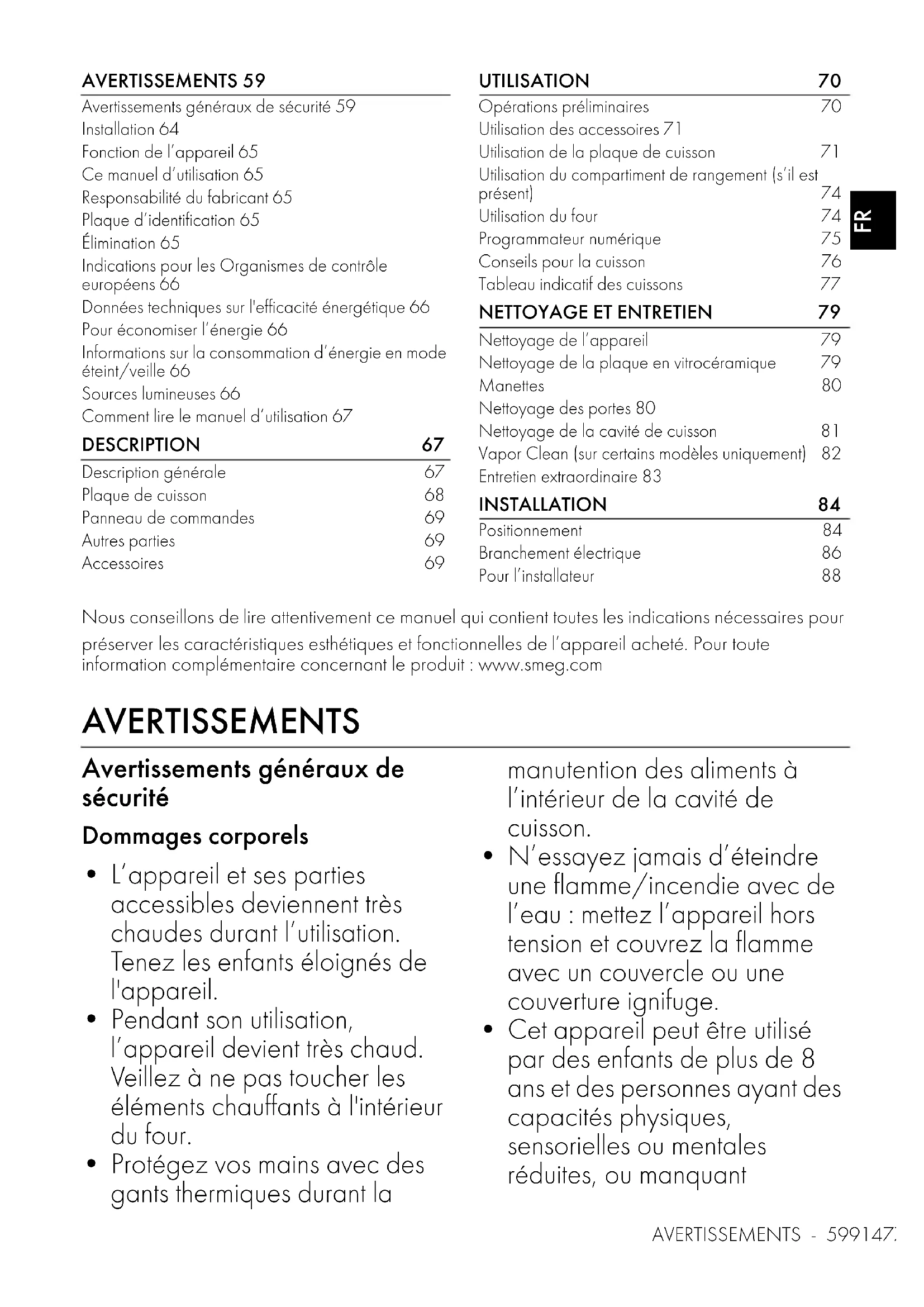 Nettoyage de l’appareil 79Nettoyage de la plaque en vitrocéramique 79Manettes 80Nettoyage des portes 80Nettoyage de la cavité de cuisson 81Vapor Clean (sur certains modèles uniquement) 82Entretien extraordinaire 83 INSTALLATION 84 Positionnement 84Branchement électrique 86Pour l’installateur 88 Nous conseillons de lire attentivement ce manuel qui contient toutes les indications nécessaires pour préserver les caractéristiques esthétiques et fonctionnelles de l’appareil acheté. Pour toute information complémentaire concernant le produit : www.smeg.com AVERTISSEMENTS Avertissements généraux de sécurité Dommages corporels