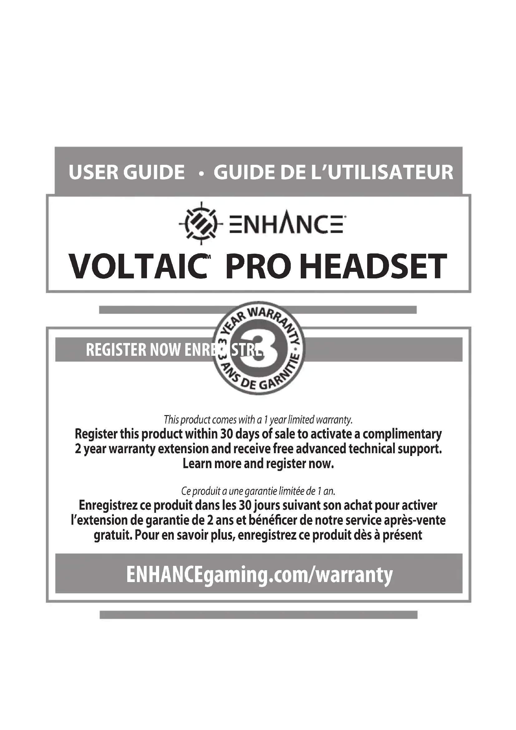 PRO HEADSET ENHANCEgaming.com Facebook.com/ENHANCEgaming ENHANCEgaming.com/recycleWindows® is a registered trademark of Microsoft Corporation in the United States and/or other countries.© 2017 AP Global, Inc. All rights reserved. Accessory Power, the Accessory Power logo, ENHANCE, the ENHANCE logo, VOLTAIC and other marks and logos are either registered trademarks or trademarks of AP Global in the United States and/or other countries. All other trademarks are the property of their respective owners. Manufactured in China. Designed in California.Windows® est une Marque déposée de Microsoft Corporations aux Etats-Unis et/ou dans d’autres pays© 2017 AP Global, Inc. Tous droits réservés. Accessory Power, le logo Accessory Power, ENHANCE, le logo ENHANCE, VOLTAIC et les autres marques et logos sont des marques déposées ou des marques de AP Global aux États-Unis et/ou dans d’autres pays. Toutes les autres marques sont la propriété de leurs propriétaires respectifs. Fabriqué en Chine. Conçu en Californie.