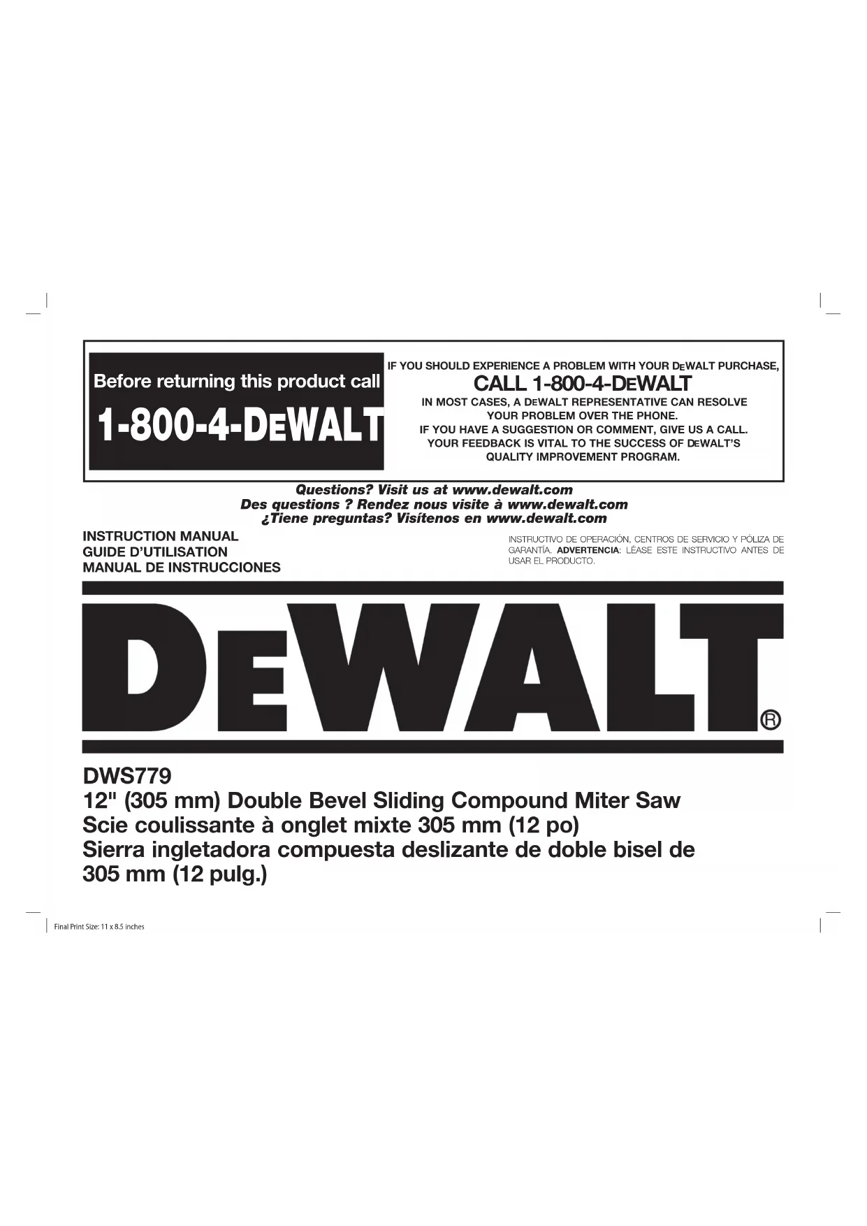 - SÉCURITÉ: l’enregistrement de votre produit nous permettra de communiquer avec vous dans l’éventualité peu probable de l’envoi d’un avis de sécurité régi par la loi fédérale américaine de la protection des consommateurs. Registre en ligne à www.dewalt.com/register. Garantie limitée de trois ans