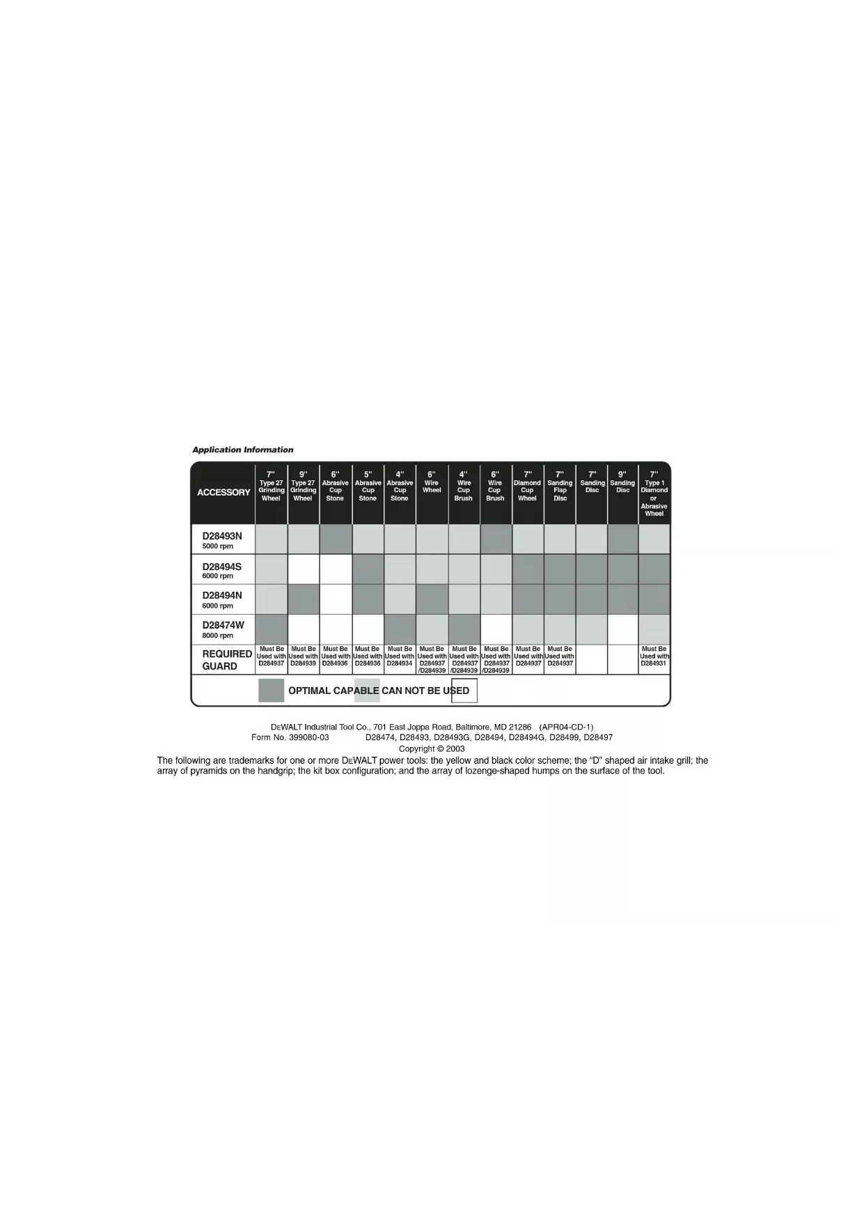 PROTECTION Il faut installer le dispositif de protection lors de l’utilisation de meules, de disques de ponçage, de brosses métalliques et de meules métalliques. L’outil peut être utilisé sans dispositif de pro- tection uniquement lors de l’utilisation de disques de ponçage tradi- tionnels. Les modèles D EWALT D28493, D28494, D28474 et D28499 sont munis d’un dispositif de protection destiné aux meules n° 27 à moyeu déporté et aux meules n° 27 avec moyeu. Ce même dispositif de protection peut être utilisé avec les disques de ponçage à feuillets, les brosses métalliques et les meules métalliques. Le meulage et la coupe avec des meules autres que les meules n° 27 et 29 nécessitent des dispositifs de protection différents qui ne sont pas four- nis avec l’outil. Les directives de mon- tage pour ces accessoires sont fournies dans l’ensemble accessoire. MISE EN GARDE : lors de l’utilisation d’une meule et d’un dispositif de protec- tion n° 27, 28, ou 29, s’assurer que la partie inférieure de la meule se trouve à l’intérieur du bord du dispositif de protection. MISE EN GARDE : la ponçeuse angulaire D