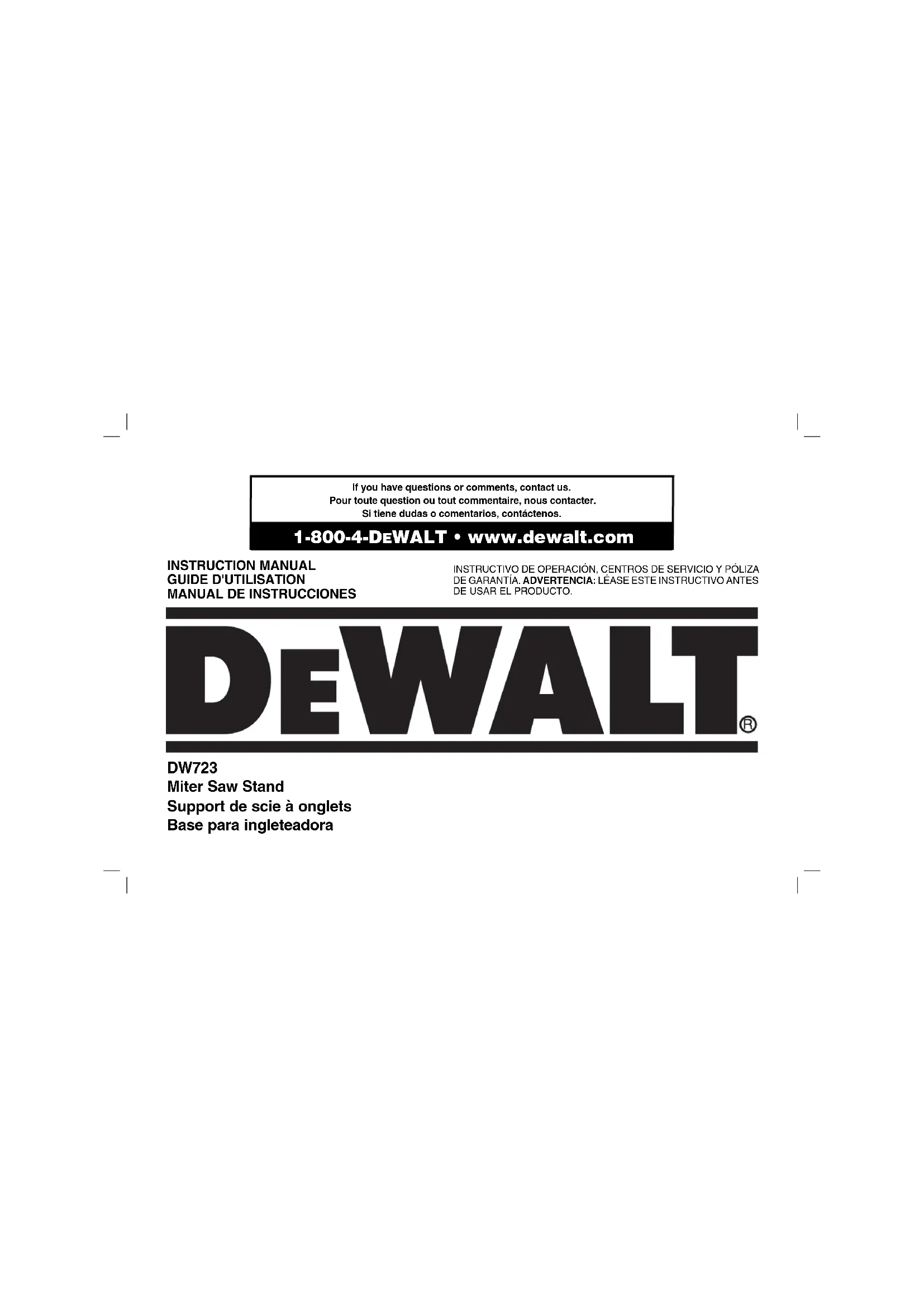 WALT (1 (800) 433-9258) Support de scie à onglets avec pattes pliantes DW723 Ce support est destiné à être utilisé avec la plupart des modèles de scie à onglets. Si on éprouve des difficultés au niveau de son alignement ou de son montage, composer le 1-800-4-D EWALT (1 800 433-9258). DW723 Support de scie à onglets BOUTON DE DÉGAGEMENTLONGERONFERRURESBRAS EXTENSIBLESUPPORT DE LA PIÈCE BUTÉE RÉGLABLEBUTÉE RÉGLABLEBUTÉE/SUPPORT AU CAPUCHON D’EXTRÉMITÉAGRAFE DE FIXATION DU POSITIONNEURLEVIERS DE DÉGAGEMENTPOIGNÉE DE TRANSPORTLA FERRURE À L’AGRAFE DE FIXATION DU POSITIONNEUR1480 mm (5 pieds-6 po) 3810 mm (12 pieds-6 po) 1480 mm (5 pieds-6 po)Français