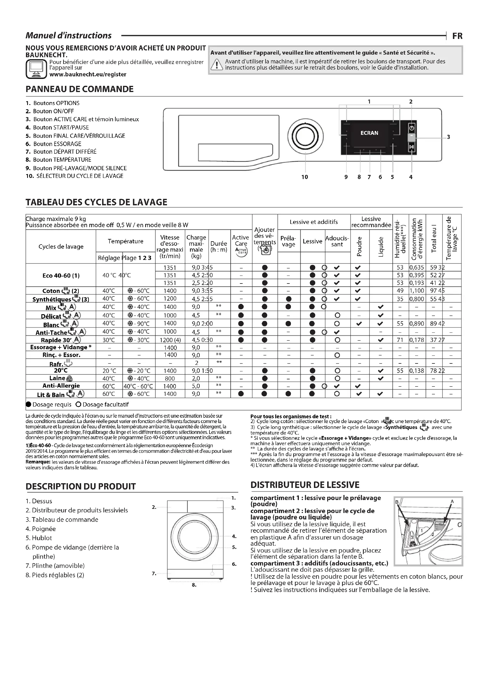 Manuel d'instructions NOUS VOUS REMERCIONS D’AVOIR ACHETÉ UN PRODUIT BAUKNECHT. Pour bénécier d'une aide plus détaillée, veuillez enregistrer l’appareil sur www.bauknecht.eu/register Avant d'utiliser l'appareil, veuillez lire attentivement le guide «Santé et Sécurité». Avant d'utiliser la machine, il est impératif de retirer les boulons de transport. Pour des instructions plus détaillées sur le retrait des boulons, voir le Guide d'installation.