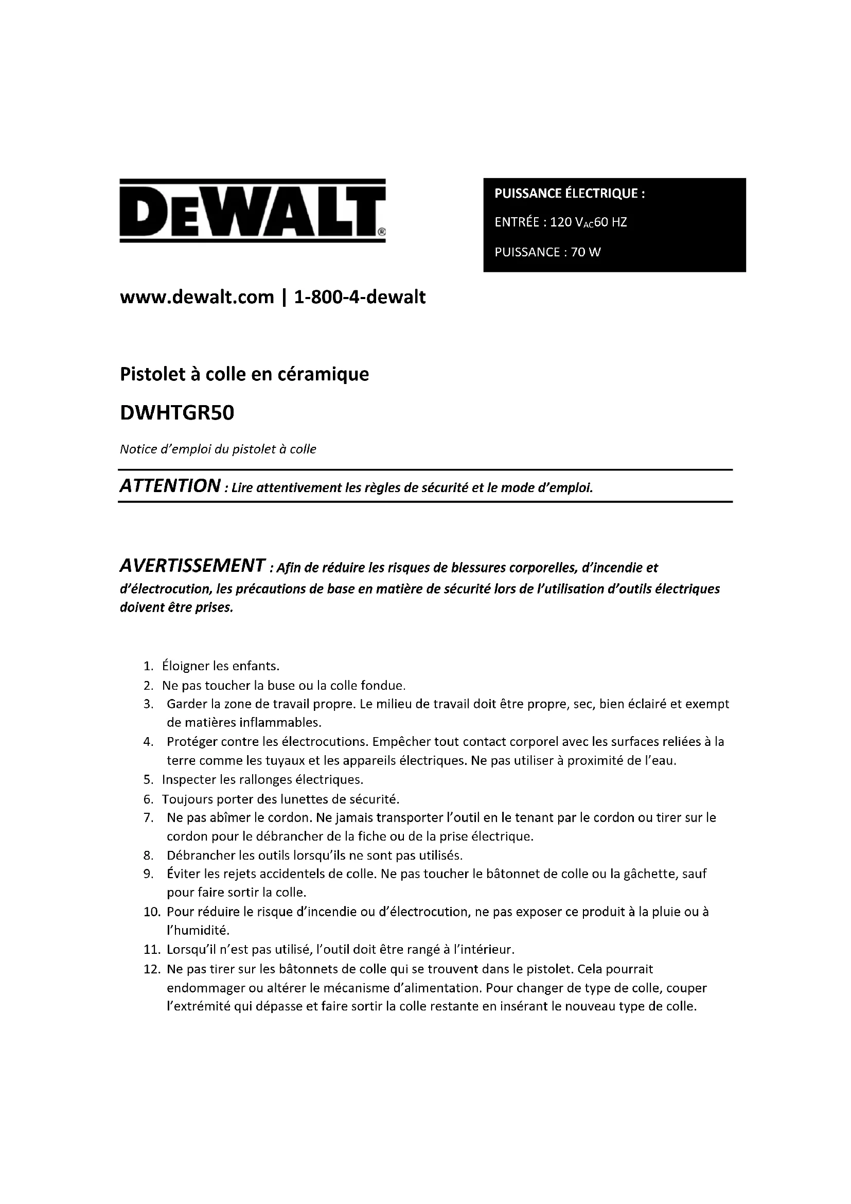 www.dewalt.com | 1-800-4-dewalt Pistolet à colle en céramique DWHTGR50 Notice d’emploi du pistolet à colle ATTENTION : Lire attentivement les règles de sécurité et le mode d’emploi.