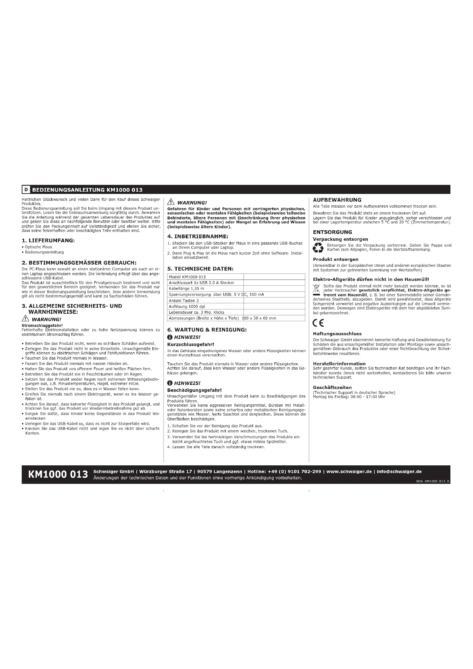 ATTENTION ! Risque de court-circuit ! L‘eau ou d‘autres liquides ayant pénétré à l‘intérieur du produit peuvent provoquer un court-circuit.N‘immergez jamais le produit dans l‘eau ou d‘autres liquides.Veillez à protéger le produit contre toute pénétration d‘eau ou d‘autre li-quide. ATTENTION ! Risque de dommages ! Une mauvaise manipulation du produit peut endommager celui-ci.N‘utilisez pas de produits de nettoyage agressifs, de brosses à poils métal-liques ou en nylon, ni d‘objets de nettoyage tranchants ou métalliques tels que des couteaux, des spatules rigides, etc. Ceux-ci peuvent endommager les surfaces du produit.1. Déconnectez le produit avant de le nettoyer.2. Nettoyez le produit avec un chiffon doux et sec.3. Pour les salissures tenaces, utilisez un chiffon légèrement humide et, si nécessaire, un peu de détergent doux.4. Laissez ensuite le produit sécher complètement.BDA_KM1000_013_bLe diamo il benvenuto e la ringraziamo per aver effettuato l’acquisto di questo prodotto SCHWAIGER.Queste istruzioni per l‘uso hanno lo scopo di aiutarvi nell‘uso del prodotto. Legga accuratamente le istruzioni per l’uso. Conservi la guida per tutta la durata del prodotto e le consegni all’eventuale successivo utilizzatore o proprietario. Verifichi che il contenuto sia completo e si accerti che non siano contenute parti difettose o danneggiate.
