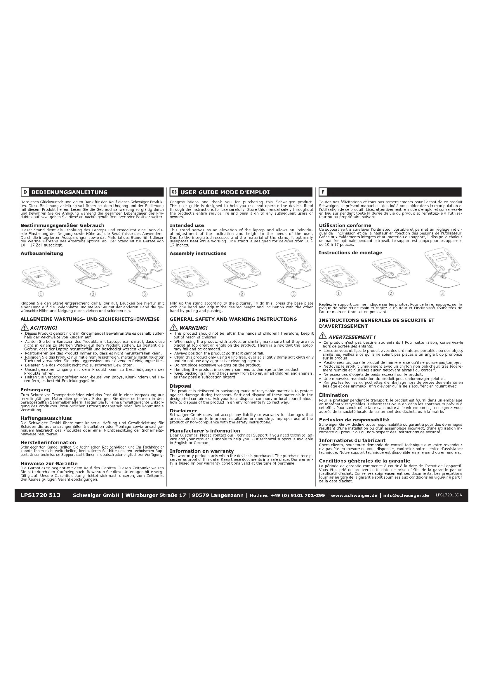 - Keep packaging film and bags away from babies, small children and animals, as they pose a suffocation hazard. Disposal The product is delivered in packaging made of recyclable materials to protect against damage during transport. Sort and dispose of these materials in the designated containers. Ask your local disposal company or local council about how to dispose of the product in an environmentally correct way. Disclaimer Schwaiger GmbH does not accept any liability or warranty for damages that are sustained due to improper installation or mounting, improper use of the product or non-compliance with the safety instructions. Manufacturer’s information Dear Customer, Please contact our Technical Support if you need technical ad- vice and your retailer is unable to help you. Our technical support is available in English or German. Information on warranty The warranty period starts when the device is purchased. The purchase receipt serves as proof of this date. Keep these documents in a safe place. Our warran- ty is based on our warranty conditions valid at the time of purchase. Toutes nos félicitations et tous nos remerciements pour l’achat de ce produit Schwaiger. Le présent manuel est destiné à vous aider dans la manipulation et l’utilisation de ce produit. Lisez attentivement le mode d’emploi et conservez-le en lieu sûr pendant toute la durée de vie du produit et remettez-le à l’utilisa- teur ou au propriétaire suivant. Utilisation conforme Ce support sert à surélever l’ordinateur portable et permet un réglage indivi- duel de l’inclinaison et de la hauteur en fonction des besoins de l’utilisateur. Grâce aux évidements intégrés et au matériau du support, il dissipe la chaleur de manière optimale pendant le travail. Le support est conçu pour les appareils de 10 à 17 pouces. Instructions de montage Instructions de montage Repliez le support comme indiqué sur les photos. Pour ce faire, appuyez sur la plaque de base d‘une main et réglez la hauteur et l‘inclinaison souhaitées de l‘autre main en tirant et en poussant.