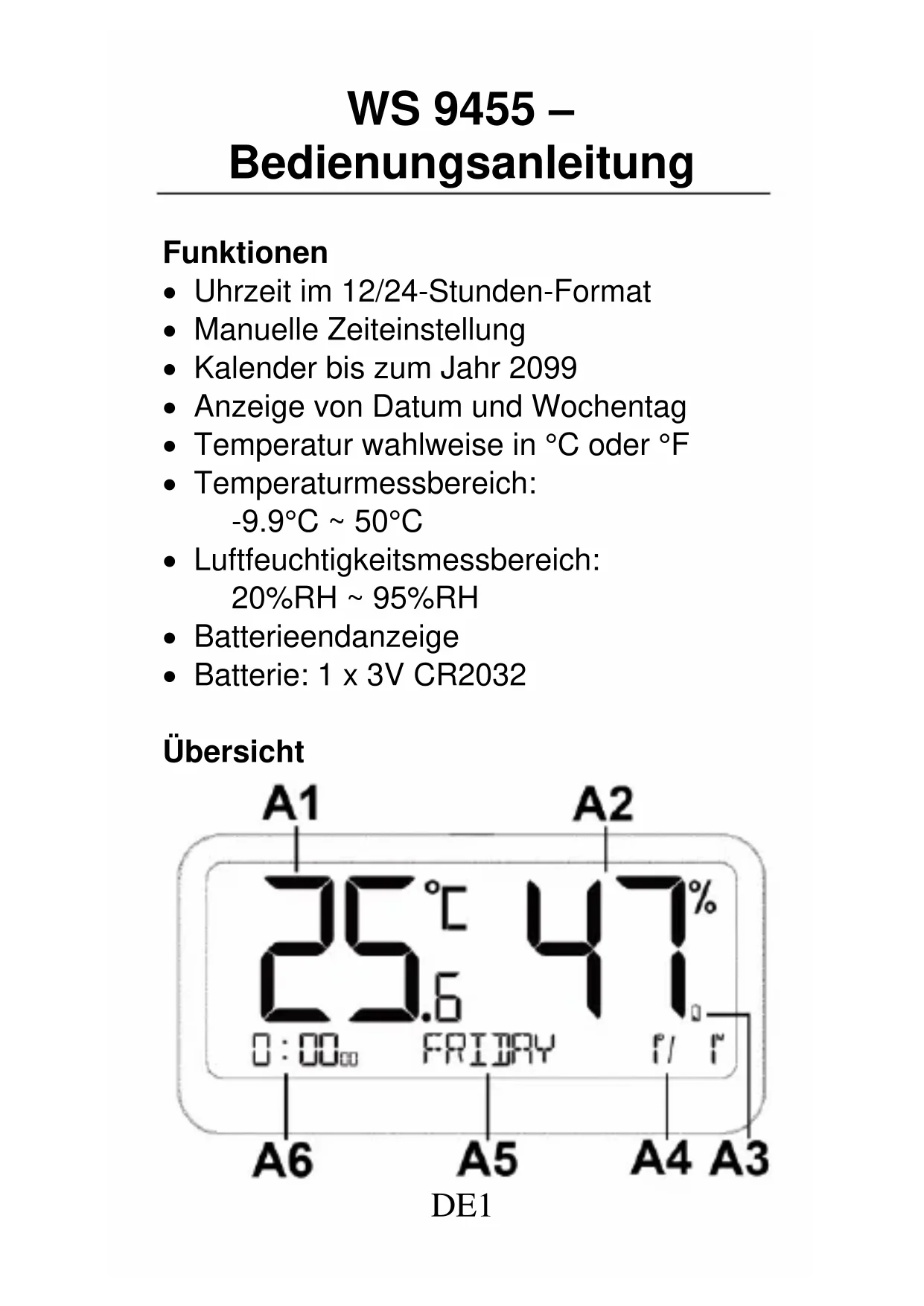 Affichage de la température en °C ou °F : La température est affichée soit en °C ou °F. Appuyez sur le bouton « - » pour basculer entre les unités de mesure. Détection de la température et de l’humidité : Plage de mesure de la température intérieure : -9,9 °C (+14 °F) ~ +50 °C (+122 °F), LL.L °C (°F) s’afficheraFR8 lorsque la valeur est inférieure à -9,9 °C (+14 °F), HH.H °C (°F) s’affichera si la valeur est supérieure à +50 °C (+122 °F). Plage de mesure de l’humidité intérieure et extérieure : 20 % HR ~ 95 % HR, 19%RH s’affichera si la valeur est inférieure à 20 % HR, 96%RH s’affiche si la valeur est supérieure à 95 % HR. Valeurs maximales et minimales de température et d’humidité Appuyez sur le bouton « + », les valeurs maximales de température et d’humidité seront affichées avec l’indication « MAX » Appuyez à nouveau sur le bouton « + », les valeurs minimales de température et d’humidité seront affichées avec l’indication « MIN » Appuyez encore une fois sur le bouton « + », pour retourner au mode d’affichage normal. Remarques : Si vous appuyez et maintenez le bouton « + » enfoncé pendant 2 secondes tout en affichant les valeursFR9 max et min, vous pouvez effacer les valeurs max et min et recommencer l’enregistrement. Les enregistrements des valeurs maximum et minimum seront automatiquement effacés et nouvellement enregistrés à 0h00 chaque jour. Indicateur de piles faibles Lorsque l’alimentation du produit est inférieure à 2,2 V (détectée par la mesure interne de faible puissance), l’indicateur de batterie faible « » s’affiche et clignote. Déclaration de conformité La déclaration de conformité de l’UE originelle est disponible à l’adresse : www.technoline.de/doc/4029665094557 Précautions Cet appareil n’est destiné qu’à une utilisation intérieure. Ne soumettez pas l’appareil à une forceFR10 ou à un choc excessif. N’exposez pas l’appareil à la lumière directe du soleil, à des températures extrêmes, à l’humidité ou à la poussière. Ne plongez pas l’appareil dans l’eau. Évitez de le mettre en contact avec des matériaux corrosifs. Ne jetez pas cet appareil au feu, il risque d’exploser. N’ouvrez pas le panneau arrière et n’apportez aucune modification aux composants de cette unité. Avertissements de sécurité concernant les piles Utilisez uniquement des piles au lithium, et non des piles rechargeables. Installez les piles en respectant les polarités (+/-). Remplacez toujours toutes les piles en même temps. Ne mélangez pas des piles usagées avec des piles neuves. Lorsque les piles sont déchargées, retirez-les immédiatement de l’appareil. Retirez les piles lorsque vous n’allez pas utiliser l’appareil.FR11 N’essayez pas de recharger des piles qui ne sont pas rechargeables et ne jetez aucune pile au feu, elle risque d’exploser. Rangez vos piles de façon à ce qu’aucun objet métallique ne puisse causer de court-circuit. Évitez d’exposer les piles à des températures extrêmes, à l’humidité ou à la lumière directe du soleil. Conservez vos piles hors de la portée des enfants. Elles présentent un risque d’étouffement. N’utilisez cet appareil que pour l’usage auquel il est destiné ! Obligation légale concernant la mise au rebut des piles Ne jetez pas les piles usagées avec les ordures ménagères, car elles sont nuisibles à la santé et à l’environnement. Vous pouvez ramener les piles usagées sans frais à votre revendeur et aux points de collecte. En tant que consommateur, vous êtes obligé par la loi de ramener les piles usagées auxFR12 revendeurs et aux points de collecte ! Respect de l’obligation de la loi sur les appareils électriques Ce symbole signifie que les appareils électriques ne doivent pas être jetés aux ordures ménagères à la fin de leur vie utile. Ramenez votre appareil à un point de collecte de déchets ou à un centre de recyclage local. Ceci s’applique à tous les pays de l’Union européenne et aux autres pays européens disposant d’un système de collecte sélectif des déchets.ES1 WS 9455 – Manual de instrucciones Datos técnicos: Hora en formato de 12/24 horas. Ajuste manual de la hora. Calendario hasta el año 2099. Pantalla de fecha y día de la semana. Temperatura alternativamente en °C o °F. Rango de medición del termómetro: -9,9 °C a 50 °C Rango de medición de la humedad: 20 % a 95 % de HR Indicador de pila baja Pilas: 1 pila CR2032 de 3 V AparienciaES2