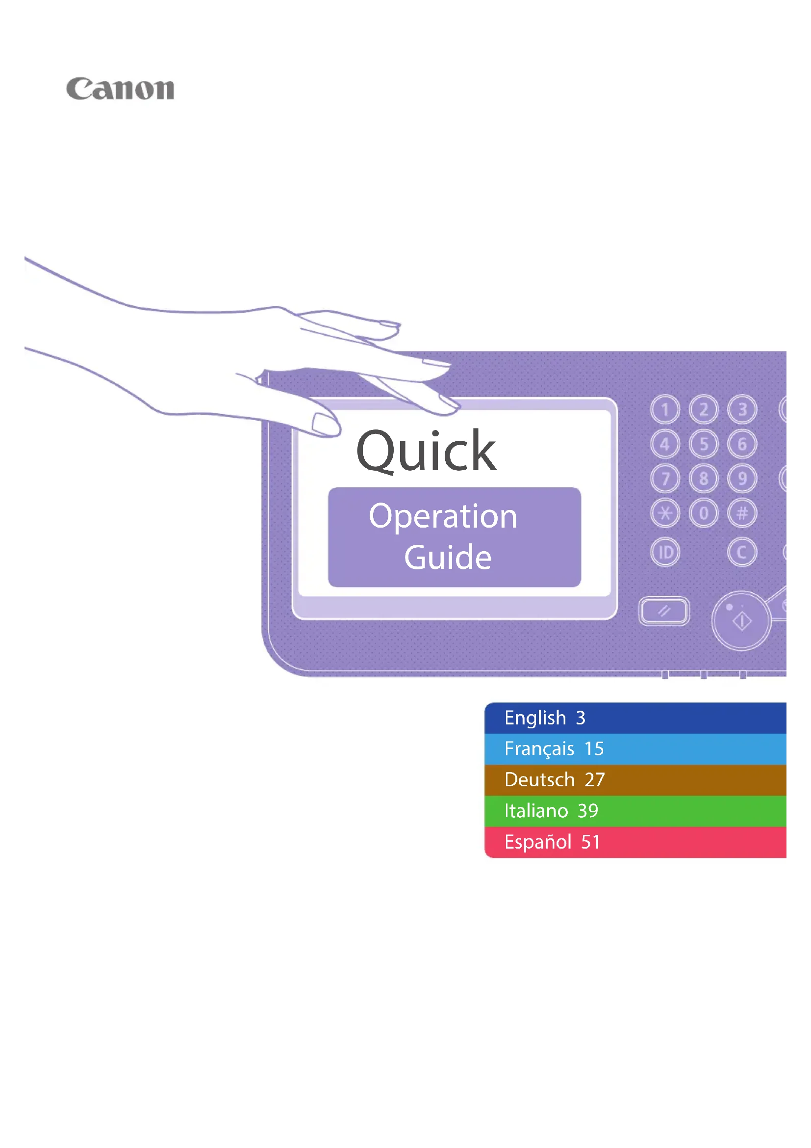 Advanced Paper Saving Options Print up to an incredible 16 pages of original documents on a single sheet of paper with [2-Sided] and [N on 1]. See “Copying” in the User’s Guide. Reorganizing Documents with Staples Just set “Manual Staple” and pass unstapled original documents through the feeder to staple them. Great for re-stapling! See “Finishing with the Stapler” in the User’s Guide. Go Green with Staple-Free Binding Bind paper without using metal staples with the Eco (Staple-Free) mode. Help the environment, and shred documents without a fuss. See “Optional Equipment” in the User’s Guide. One-touch Settings Register often used combinations of settings to “Home” to eciently use them with a single button. See “Customizing the Touch Panel Display” in the User’s Guide.d'utilisation rapide G u i d e Rangez ce guide dans un endroit sûr pour pouvoir le consulter ultérieurement. Si votre appareil est un modèle n'assurant que l'impression Un appareil n'assurant que l'impression ne peut être utilisé pour aucune autre fonction que l'impression. Notez qu'en plus de l'impression, ce guide comprend également les descriptions et les instructions pour la copie, la télécopie et la numérisation ; ne lisez que les descriptions qui vous sont nécessaires pour utiliser l'appareil. Certaines fonctions risquent de ne pas être disponibles, selon le modèle de machine utilisé. Les informations contenues dans ce document peuvent être modi˜ées sans avis préalable.d'utilisation rapide G u i d e Rangez ce guide dans un endroit sûr pour pouvoir le consulter ultérieurement. Si votre appareil est un modèle n'assurant que l'impression Un appareil n'assurant que l'impression ne peut être utilisé pour aucune autre fonction que l'impression. Notez qu'en plus de l'impression, ce guide comprend également les descriptions et les instructions pour la copie, la télécopie et la numérisation ; ne lisez que les descriptions qui vous sont nécessaires pour utiliser l'appareil. Certaines fonctions risquent de ne pas être disponibles, selon le modèle de machine utilisé. Les informations contenues dans ce document peuvent être modi˜ées sans avis préalable. Apprendre à utiliser l’appareil 16 Astuces pour copier 18 Astuces pour l’impression 19 Astuces pour le fax 20 Astuces pour la numérisation 21 Astuces pour l’enregistrement de destinataires