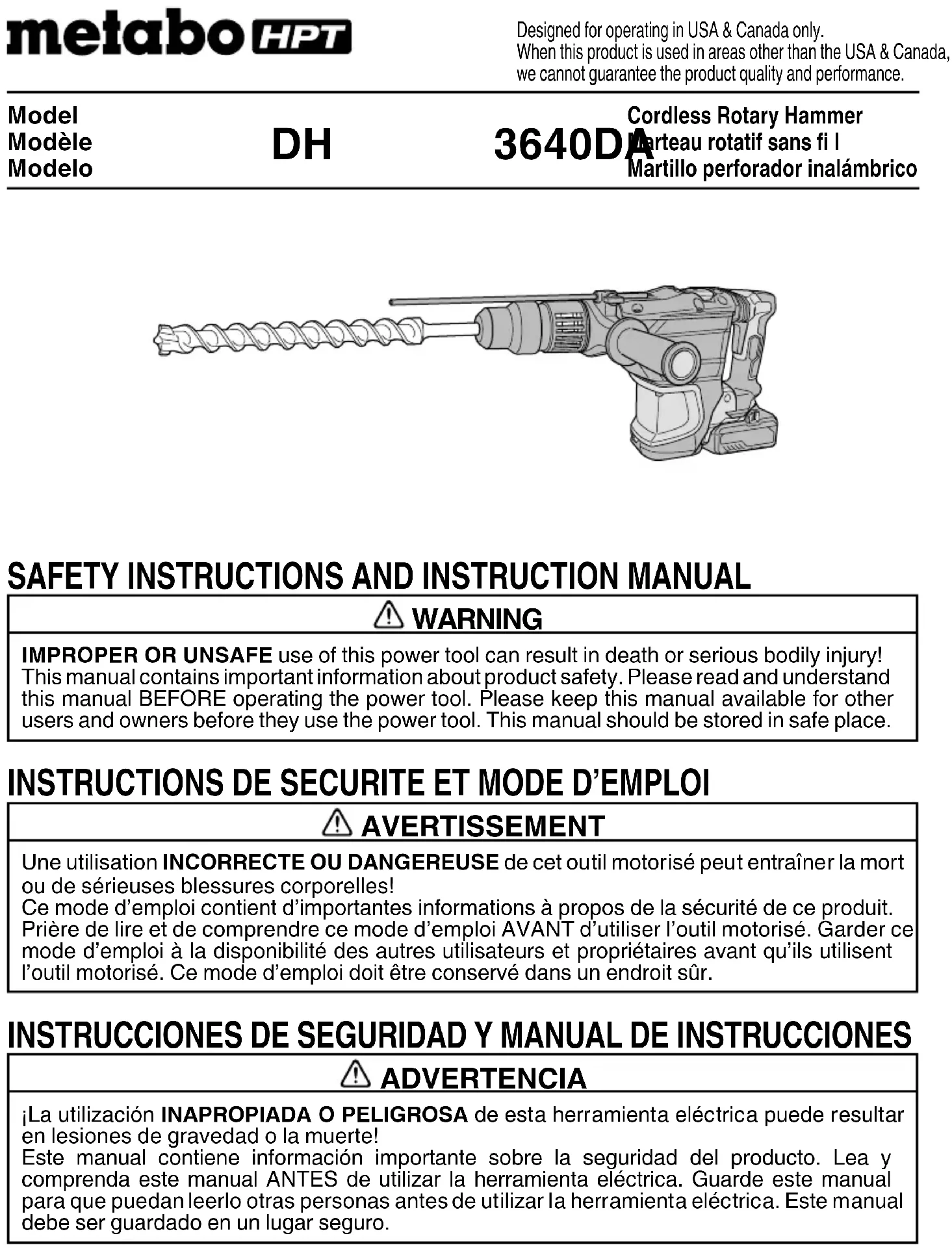 NOTE Specifi cations are subject to change without any obligation on the part of the metabo HPT. 000BookDH3640DANA.indb27000BookDH3640DANA.indb27 2023/06/147:34:492023/06/147:34:49INFORMATIONS IMPORTANTES DE SÉCURITÉ Lire et comprendre toutes les précautions de sécurité, les avertissements et les instructions de fonctionnement dans ce mode d’emploi avant d’utiliser ou d’entretenir cet outil motorisé. La plupart des accidents causés lors de l’utilisation ou de l’entretien de l’outil motorisé proviennent d’un non respect des règles ou précautions de base de sécurité. Un accident peut la plupart du temps être évité si l’on reconnaît une situation de danger potentiel avant qu’elle ne se produise, et en observant les procédures de sécurité appropriées. Les précautions de base de sécurité sont mises en évidence dans la section “SECURITE” de ce mode d’emploi et dans les sections qui contiennent les instructions de fonctionnement et d’entretien. Les dangers qui doivent être évités pour prévenir des blessures corporelles ou un endommagement de la machine sont identifi és par AVERTISSEMENTS sur l’outil motorisé et dans ce mode d’emploi. NE JAMAIS utiliser cet outil motorisé d’une manière qui n’est pas spécifi quement recommandée par metabo HPT.
