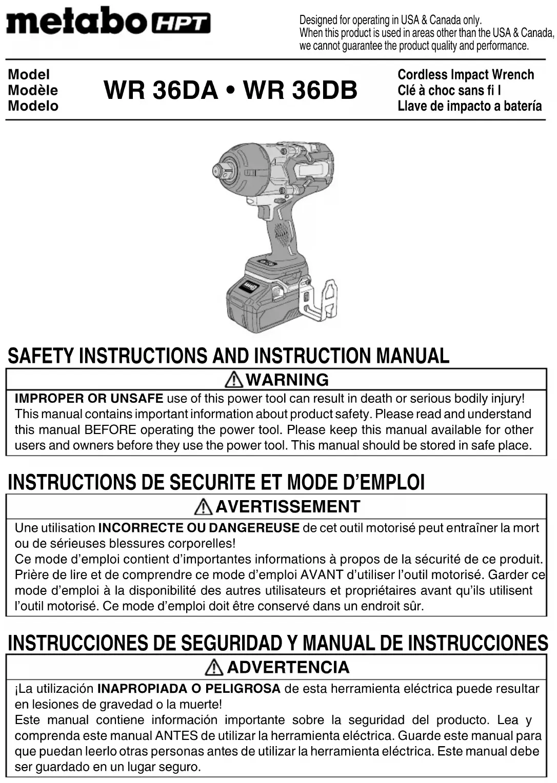 English 000BookWR36DA.indb24000BookWR36DA.indb24 2018/04/0410:43:532018/04/0410:43:53CONSIGNES DE SÉCURITÉ IMPORTANTES Lire et comprendre toutes les précautions de sécurité, les avertissements et les instructions de fonctionnement dans ce mode d’emploi avant d’utiliser ou d’entretenir cet outil motorisé. La plupart des accidents causés lors de l’utilisation ou de l’entretien de l’outil motorisé proviennent d’un non respect des règles ou précautions de base de sécurité. Un accident peut la plupart du temps être évité si l’on reconnaît une situation de danger potentiel avant qu’elle ne se produise, et en observant les procédures de sécurité appropriées. Les précautions de base de sécurité sont mises en évidence dans la section “SECURITE” de ce mode d’emploi et dans les sections qui contiennent les instructions de fonctionnement et d’entretien. Les dangers qui doivent être évités pour prévenir des blessures corporelles ou un endommagement de la machine sont identifi és par AVERTISSEMENTS sur l’outil motorisé et dans ce mode d’emploi. NE JAMAIS utiliser cet outil motorisé d’une manière qui n’est pas spécifi quement recommandée par metabo HPT.