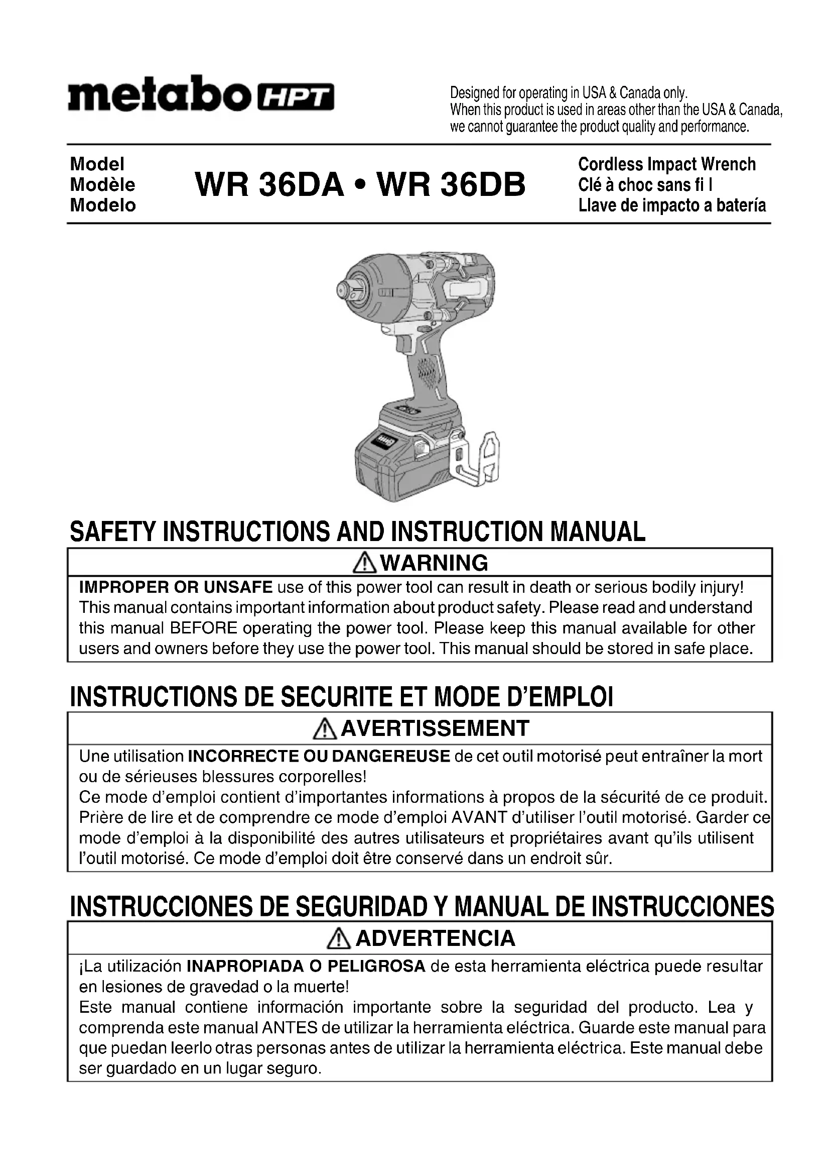 English 000BookWR36DA.indb24000BookWR36DA.indb24 2018/04/0410:43:532018/04/0410:43:53CONSIGNES DE SÉCURITÉ IMPORTANTES Lire et comprendre toutes les précautions de sécurité, les avertissements et les instructions de fonctionnement dans ce mode d’emploi avant d’utiliser ou d’entretenir cet outil motorisé. La plupart des accidents causés lors de l’utilisation ou de l’entretien de l’outil motorisé proviennent d’un non respect des règles ou précautions de base de sécurité. Un accident peut la plupart du temps être évité si l’on reconnaît une situation de danger potentiel avant qu’elle ne se produise, et en observant les procédures de sécurité appropriées. Les précautions de base de sécurité sont mises en évidence dans la section “SECURITE” de ce mode d’emploi et dans les sections qui contiennent les instructions de fonctionnement et d’entretien. Les dangers qui doivent être évités pour prévenir des blessures corporelles ou un endommagement de la machine sont identifi és par AVERTISSEMENTS sur l’outil motorisé et dans ce mode d’emploi. NE JAMAIS utiliser cet outil motorisé d’une manière qui n’est pas spécifi quement recommandée par metabo HPT.