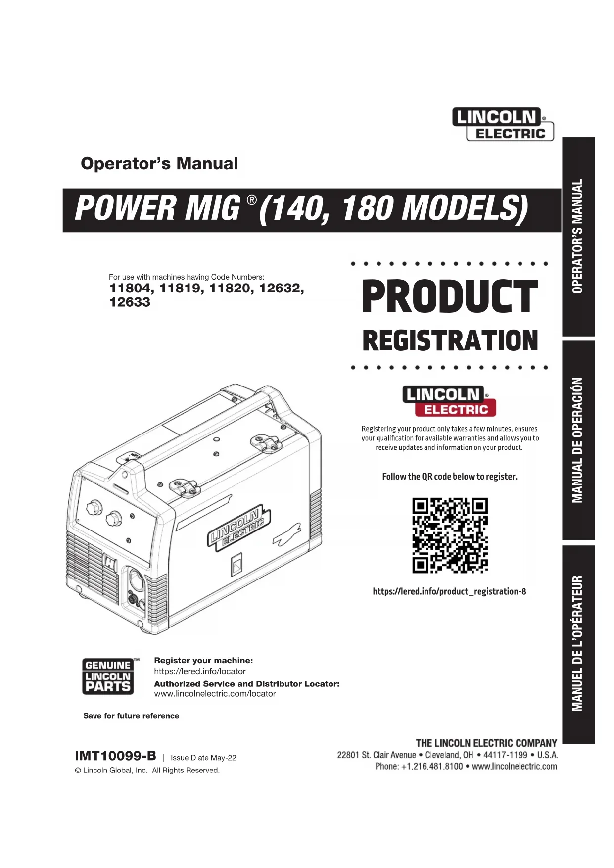 (MODÈLS 140, 180) Pour enregistrer la machine : www.lincolnelectric.com/register Recherche d’Atelier de Service et Distributeur Agréés: www.lincolnelectric.com/locator IMF10099-B | Issue D ate May-22 © Lincoln Global, Inc. All Rights Reserved. Pour utilisation avec les machines ayant les Numéros de Code: 11804, 11819, 11820, 12632,
