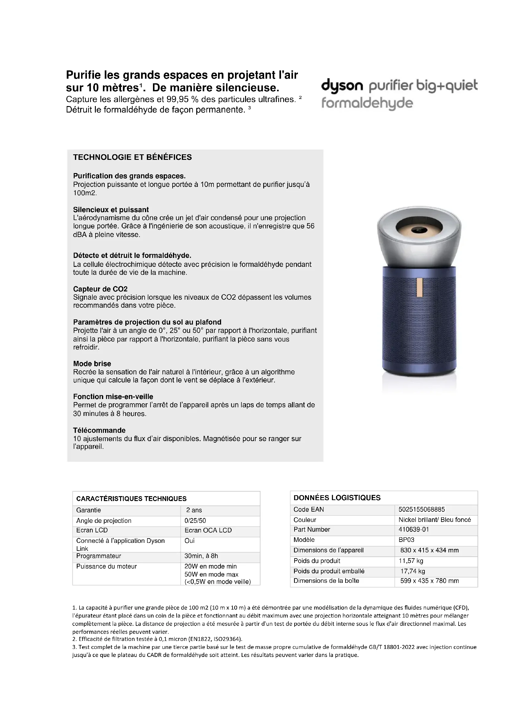 | Caractéristiques techniques | Filtration HEPA H13, capteur de formaldéhyde, débit d'air de 500 m³/h |