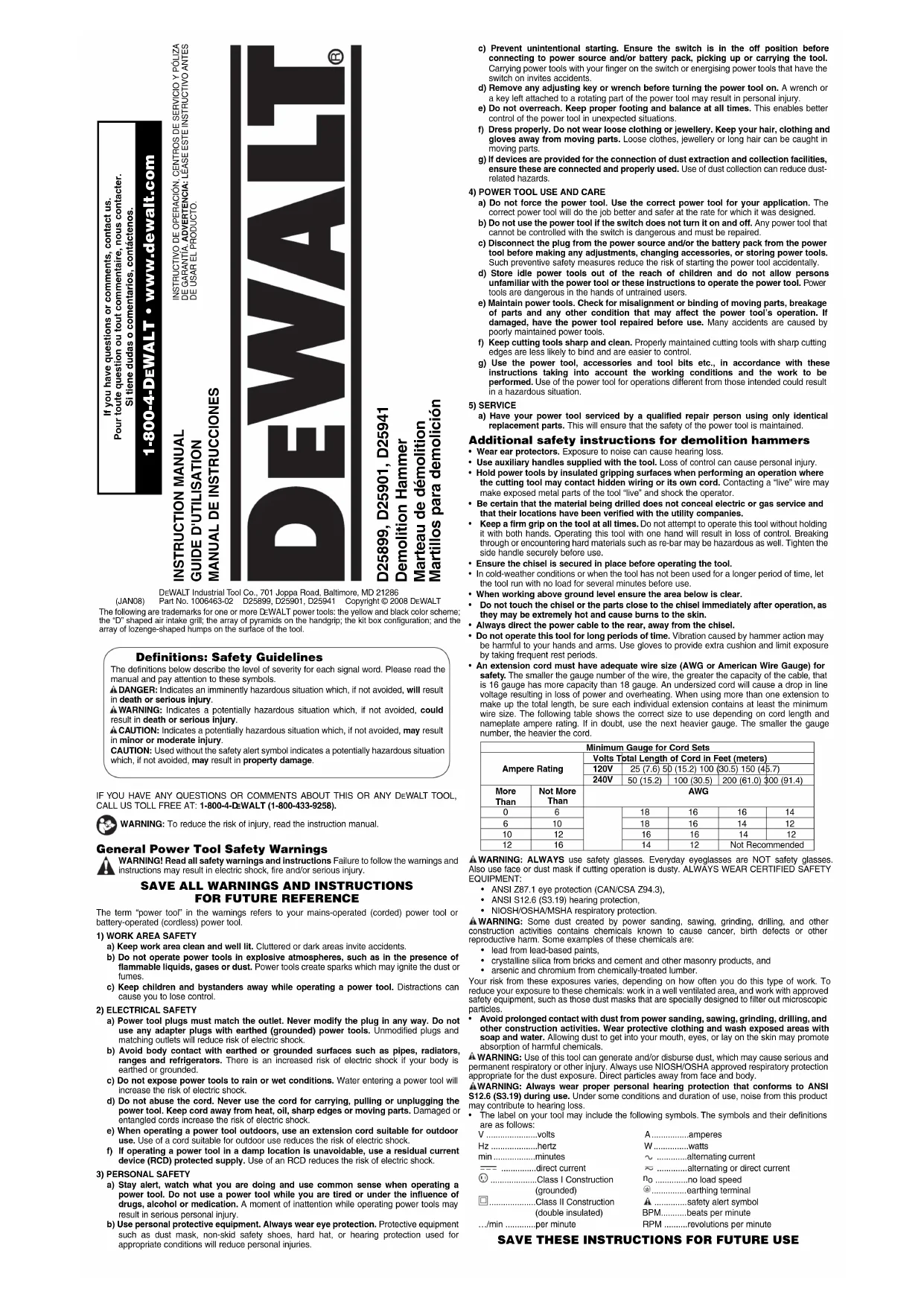 Les marteaux de démolition de service intensif, modèles D25899, D25901 et D25941, sont conçus pour la démolition, le burinage et la gravure professionnels dans le béton, la brique, la pierre et autres matières de maçonnerie. NE PAS utiliser dans des conditions humides ou en présence de liquides ou de gaz inflammables. Ces marteaux de démolition robustes sont des outils électriques professionnels. NE PAS laisser les enfants toucher à l’outil. Les opérateurs inexpérimentés doivent être supervisés lorsqu’ils utilisent cet outil. Risques résiduels