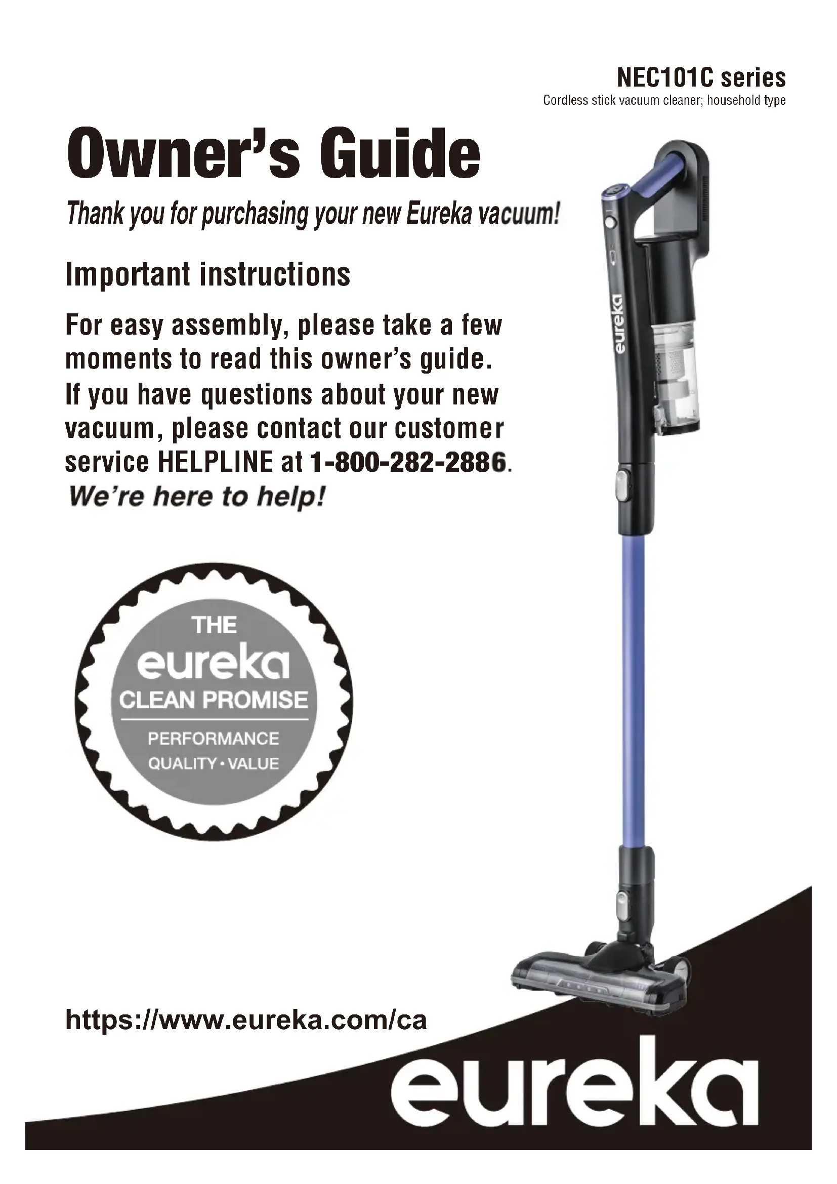 - Merci d'avoir acheté votre nouvel aspirateur Eureka !Consignes importantesPour un assemblage facile, veuillez prendre quelques instants pour lire ce guide du propriétaire. Si vous avez des questions sur votre nouvel aspirateur, veuillez contacter notre service à la clientèle HELPLINE au 1-800-282-2886. Nous sommes là pour vous aider !Eureka s'engage à respecter notre promesse propre.En savoir plus sur www.eureka.com/cleanpromisewww.eureka.com Guide du propriétaire Série NEC101Aspirateur-balai sans l; type de ménage