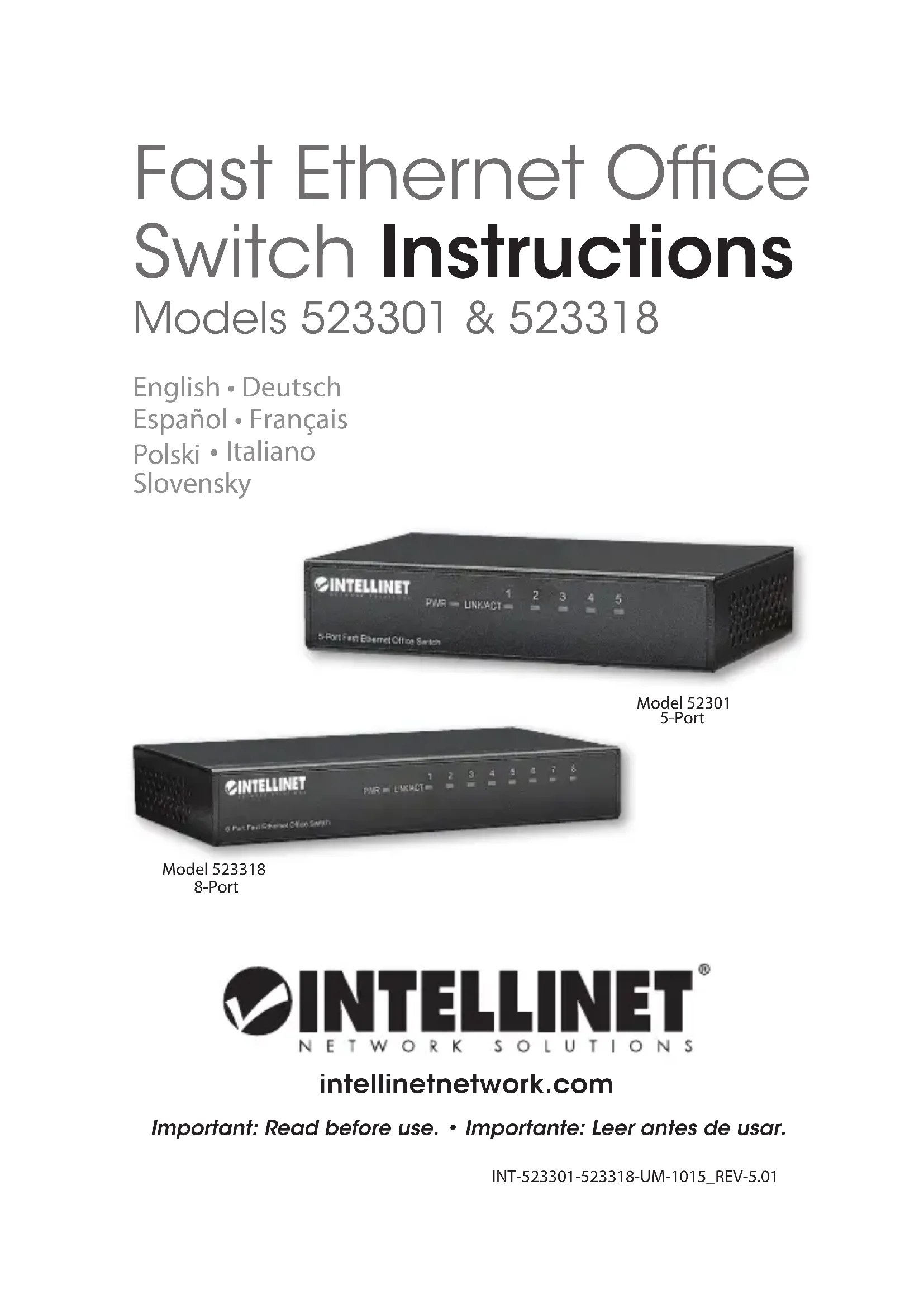 Merci d’avoir acheté l’Intellinet Network Solutions Switch Fast Ethernet de bureau, modèle 523301 (5 ports, boîtier métallique) ou modèle 523318 (8 ports, boîtier métallique). DELS Les voyants d’état—Alimentation, Connexion/ Activité—pour des informations et le dépannage. CONNEXIONS Alimentation Branchez la prise femelle de l’adaptateur secteur à la prise jack et la che à une prise de courant, puis assurez-vous que que le voyant “PWR” est allumé. NOTE: An d’ assurer le propre fonctionnement, n’utilisez que l‘adaptateur secteur fourni avec ce produit. Tous les ports de ce commutateur prennent en charge la fonctionnalité Auto-MDI/MDI-X, donc des câbles croisés et des liaisons montantes ne sont pas nécessaires pour des connections aux PC, routeurs, concentratreurs, etc. Des câbles Cat5/5e UTP/STP garantissent des performances optimales; si un DEL n’indique pas d’activité, vériez l’appareil correspondant. INSTALLATION Avant d’utiliser le commutateur, il est recommandé de le placer: