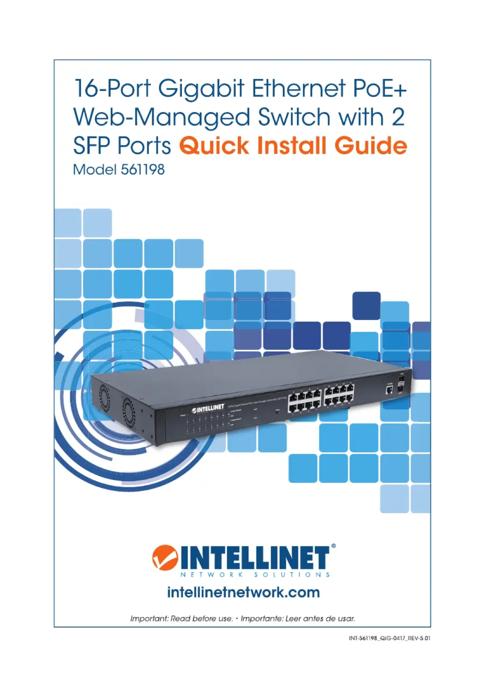 EspañolFrançais Commutateur Web PoE+ Gigabit Ethernet 16 ports avec 2 ports SFP Ce guide décrit les bases pour congurer et opérer cet appareil. Pour des instructions et spécications détailées, veuillez lire le manuel de l’utilisateur inclus ou sur intellinetnetwork.com. Placement Avant d’utiliser le commutateur, il est recommandé de le placer:
