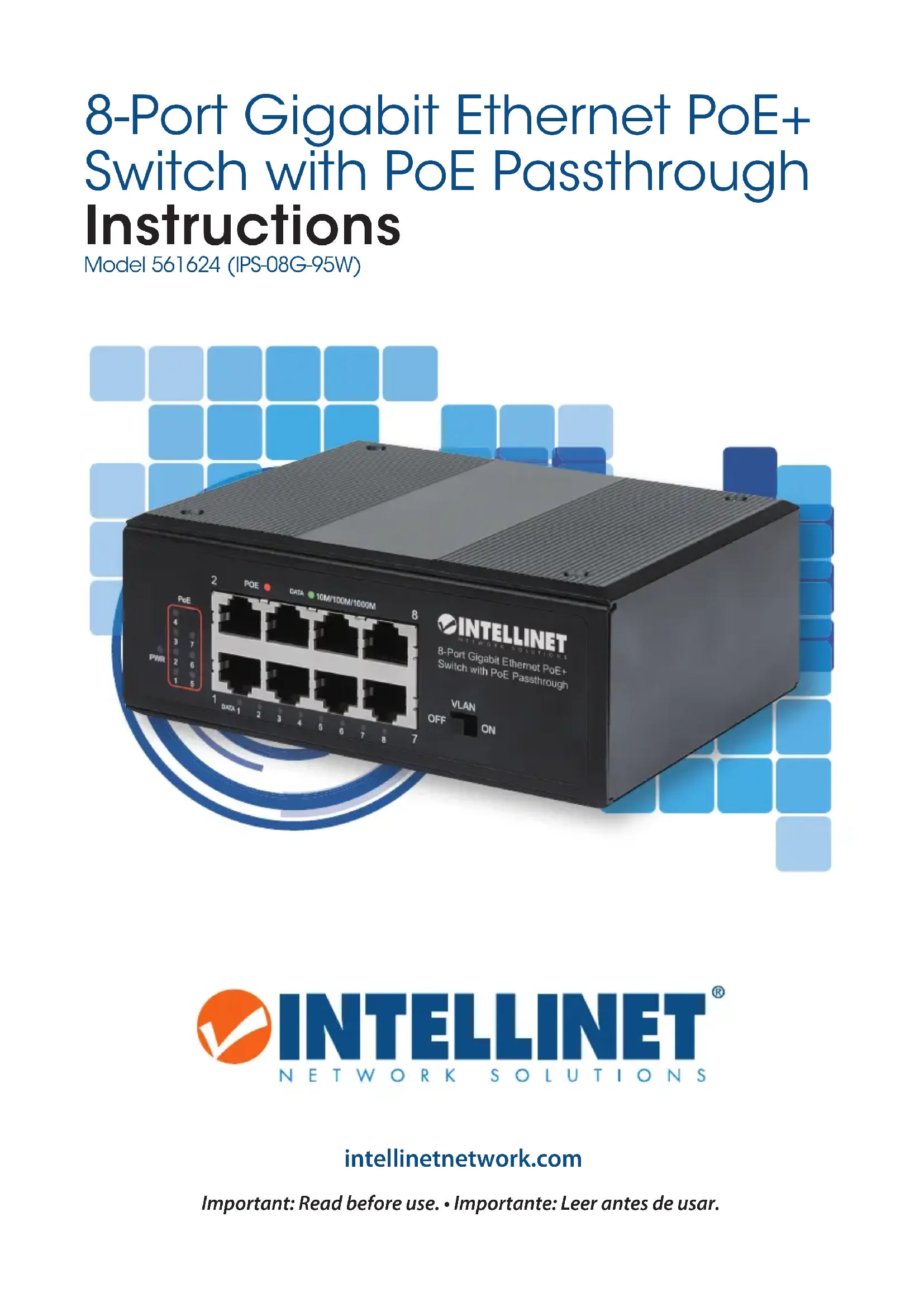 PoE Switch / Injector PSE PSE (equipos de suministro de energía) Energía y Datos (hasta 95 W) PD (dispositivo alimentado) Energía y Datos8 Commutateur PoE+ 8 ports Ethernet Gigabit avec passage PoEInstructions L’Intellinet Commutateur PoE+ 8 ports Ethernet Gigabit avec passage PoE propose toute une gamme de fonctionnalités assurant le débit optimal de votre réseau, ainsi qu’un gain notable de temps et d’argent. Pas besoin de configuration, puisque l’installation se fait en plug and play. Vous trouvez les spécifications sur intellinetnetwork.com/barcode/561624. Traits