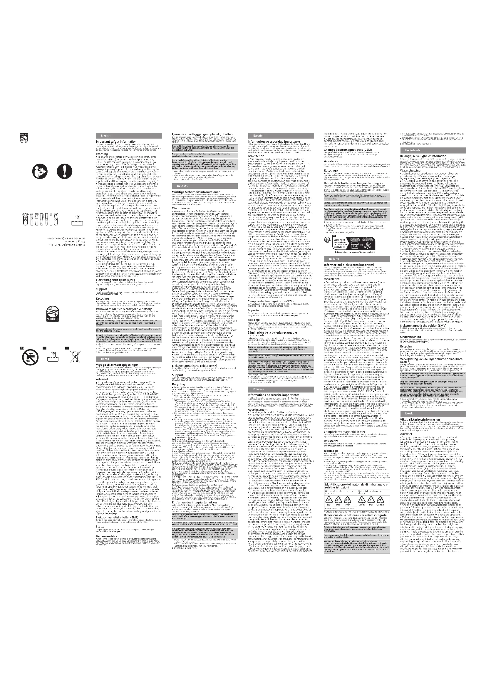 - Ce symbole signie que les produits électriques et les piles ne doivent pas être jetées avec les ordures ménagères (Fig. 3). •Respectez la réglementation de votre pays concernant la collecte sélective des produits électriques et des piles. Retrait de la batterie rechargeable intégrée La batterie rechargeable intégrée doit être retirée exclusivement par un professionnel qualié lors de la mise au rebut de l’appareil. Avant d’enlever la batterie, assurez-vous que l’appareil est débranché de la prise secteur et que la batterie est complètement vide. Respectez toutes les mesures de sécurité nécessaires lorsque vous utilisez des outils pour ouvrir l'appareil ou retirer la batterie rechargeable. Lorsque vous manipulez des piles, assurez-vous de bien sécher vos mains, le produit et les piles. Pour éviter tout court-circuit accidentel des piles après leur retrait, ne laissez pas les bornes des piles entrer en contact avec des objets métalliques (pièces de monnaie, épingles à cheveux, bagues, etc.). Ne les emballez pas dans du papier d’aluminium. Collez les bornes des piles avec du ruban adhésif ou mettez les piles dans un sac en plastique avant de les jeter. 1 Vériez si des vis sont présentes dans le boîtier de l’appareil. Si c'est le cas, enlevez-les. 2 Retirez les vis, panneaux ou pièces supplémentaires de l’appareil jusqu’à ce que le circuit imprimé et la batterie rechargeable soient visibles. 3 Retirez la batterie rechargeable. Points de collecte sur www.quefairedemesdechets.fr Cet appareil, son cordon et ses accessoires se recyclent Italiano Informazioni di sicurezza importanti Utilizzate il prodotto solo per lo scopo previsto. Prima di utilizzare il prodotto, le batterie e gli accessori, leggete attentamente queste informazioni importanti e conservatele per eventuali riferimenti futuri. L'uso improprio può causare pericoli o lesioni gravi. Gli accessori forniti potrebbero variare a seconda del prodotto. Avvertenza
