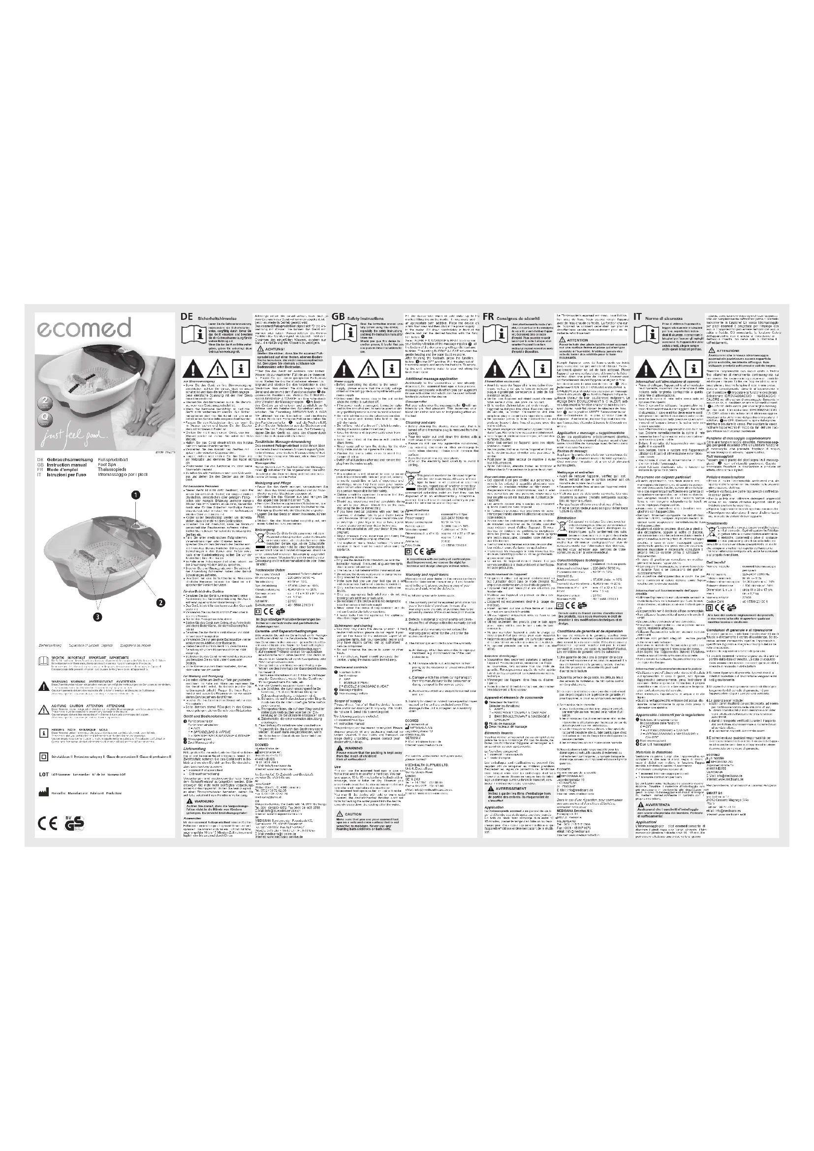 La fourniture comprend: 1 ecomed Thalassopieds 1 mode d'emploiVeillez à garder les films d’emballage hors de portée des enfants. Ils risqueraient de s’étouffer!ApplicationLe thalassopieds ecomed vous permet de soula-ger et détendre vos pieds après une dure journée. Un bain de pieds avec massage dure entre 10 et 15 minutes, prenez le temps d'en faire un ou deux chaque jour. Vous devez cependant veiller à ce quel'appareil refroidisse entièrement avant de le réutili-ser! G Le ecomed est conçu pour l'utilisa-Thalassopieds tion avec de l'eau. Vous pouvez remplir l'appareil avec de l'eau chaude ou froide. La fonction chaleur de l'appareil ne convient cependant pas pour ré-chauffer l'eau versée, mais seulement pour en re-tarder le refroidissement. GATTENTIONPosez le bain des pieds bouillonnant ecomed sur une surface ferme et plane qui n'est pas sensible à l'humidité. N'utilisez jamais des sels de bain / des additifs pour le bain moussants.Remplir l'appareil avec de l'eau chaude ou froide jusqu'au repère marqué sur le bord intérieur. Éven-tuellement ajouter un sel de bain adéquat. Placer l'appareil sur une surface plane et brancher la fiche secteur dans une prise de courant. Asseyez-vous confortablement devant l'appareil et réglez la fonc-tion désirée avec le sélecteur de fonction . Sé-lectionnez BAIN BOUILLONNANT & MASSAGE & CHALEUR pour stimuler vos pieds par un massage vibrant des picots au fond de l'appareil et par la douce chaleur du bain bouillonnant revigorant. Le réglage BAIN BOUILLONNANT & CHALEUR acti-ve uniquement la fonction chaleur et bain bouillon-nant. Après avoir fini, placez le sélecteur de fonc-tion sur la position ARRÊT. Débranchez le cor- don d'alimentation de la prise et videz l'eau de l'appareil. Pour le vider, inclinez l'appareil de sorte que l'eau puisse s'écouler à travers le déversoir en arrière. G