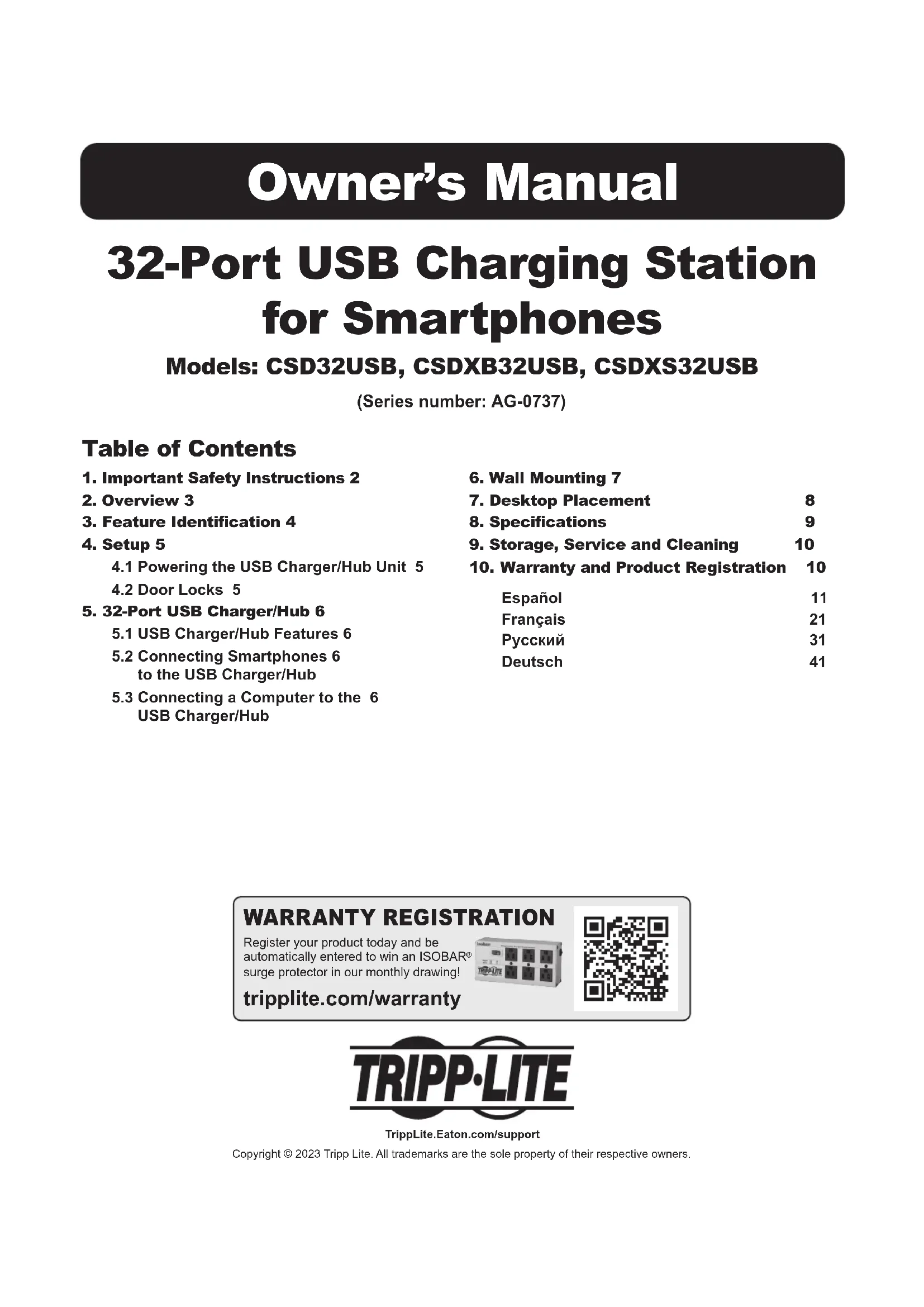 Station de charge USB 32 ports pour smartphones Modèles : CSD32USB, CSDXB32USB, CSDXS32USB (Numéro de série : AG-0737) Manuel d'utilisation TrippLite.Eaton.com/support Copyright © 2023 Tripp Lite. Toutes les marques commerciales appartiennent exclusivement à leurs propriétaires respectifs.22