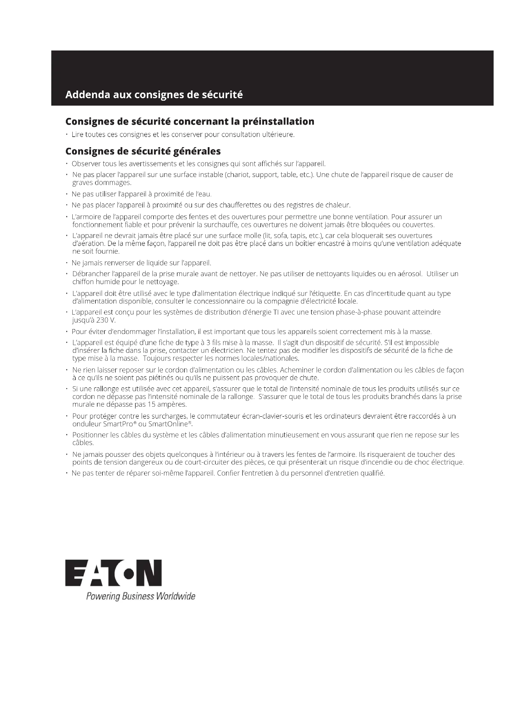 - Ne pas marcher ou se tenir sur un appareil lors de l’entretien des autres appareils dans un bâti. La politique de Eaton en est une d’amélioration continue. Les spécications sont sujettes à changement sans préavis. Eaton 1000 Eaton Boulevard Cleveland, OH 44122 États-Unis Eaton.com © 2023 Eaton Tous droits réservés. Publication n° 23-11-050/93-336E_RevC Décembre 2023 Eaton est une marque déposée. Toutes les marques de commerce sont la propriété de leurs propriétaires respectifs.