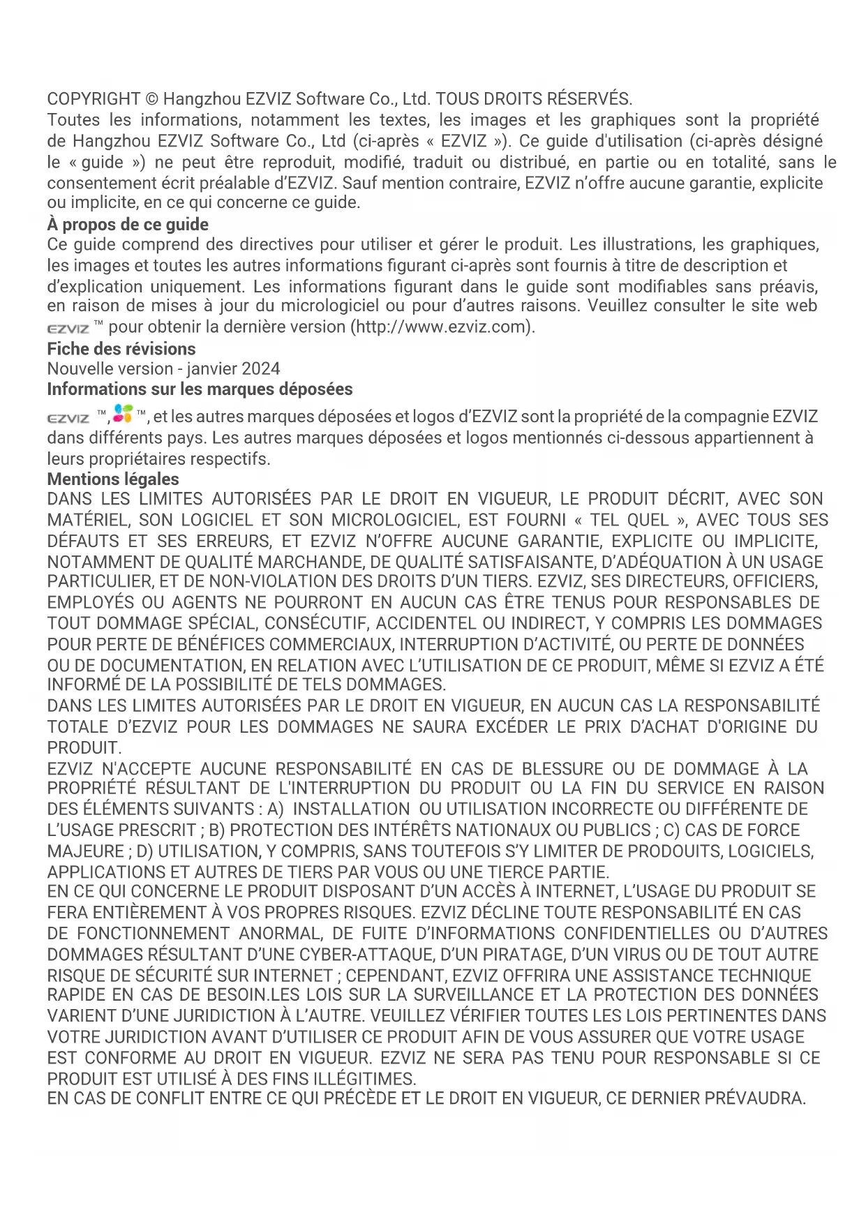 COPYRIGHT © Hangzhou EZVIZ Software Co., Ltd. TOUS DROITS RÉSERVÉS. Toutes les informations, notamment les textes, les images et les graphiques sont la propriété de Hangzhou EZVIZ Software Co., Ltd (ci-après « EZVIZ »). Ce guide d'utilisation (ci-après désigné le « guide ») ne peut être reproduit, modié, traduit ou distribué, en partie ou en totalité, sans le consentement écrit préalable d’EZVIZ. Sauf mention contraire, EZVIZ n’offre aucune garantie, explicite ou implicite, en ce qui concerne ce guide. À propos de ce guide Ce guide comprend des directives pour utiliser et gérer le produit. Les illustrations, les graphiques, les images et toutes les autres informations gurant ci-après sont fournis à titre de description et d’explication uniquement. Les informations gurant dans le guide sont modiables sans préavis, en raison de mises à jour du micrologiciel ou pour d’autres raisons. Veuillez consulter le site web ™ pour obtenir la dernière version (http://www.ezviz.com). Fiche des révisions Nouvelle version - janvier 2024 Informations sur les marques déposées ™, ™, et les autres marques déposées et logos d’EZVIZ sont la propriété de la compagnie EZVIZ dans différents pays. Les autres marques déposées et logos mentionnés ci-dessous appartiennent à leurs propriétaires respectifs. Mentions légales DANS LES LIMITES AUTORISÉES PAR LE DROIT EN VIGUEUR, LE PRODUIT DÉCRIT, AVEC SON MATÉRIEL, SON LOGICIEL ET SON MICROLOGICIEL, EST FOURNI « TEL QUEL », AVEC TOUS SES DÉFAUTS ET SES ERREURS, ET EZVIZ N’OFFRE AUCUNE GARANTIE, EXPLICITE OU IMPLICITE, NOTAMMENT DE QUALITÉ MARCHANDE, DE QUALITÉ SATISFAISANTE, D’ADÉQUATION À UN USAGE PARTICULIER, ET DE NON-VIOLATION DES DROITS D’UN TIERS. EZVIZ, SES DIRECTEURS, OFFICIERS, EMPLOYÉS OU AGENTS NE POURRONT EN AUCUN CAS ÊTRE TENUS POUR RESPONSABLES DE TOUT DOMMAGE SPÉCIAL, CONSÉCUTIF, ACCIDENTEL OU INDIRECT, Y COMPRIS LES DOMMAGES POUR PERTE DE BÉNÉFICES COMMERCIAUX, INTERRUPTION D’ACTIVITÉ, OU PERTE DE DONNÉES OU DE DOCUMENTATION, EN RELATION AVEC L’UTILISATION DE CE PRODUIT, MÊME SI EZVIZ A ÉTÉ INFORMÉ DE LA POSSIBILITÉ DE TELS DOMMAGES. DANS LES LIMITES AUTORISÉES PAR LE DROIT EN VIGUEUR, EN AUCUN CAS LA RESPONSABILITÉ TOTALE D’EZVIZ POUR LES DOMMAGES NE SAURA EXCÉDER LE PRIX D’ACHAT D'ORIGINE DU PRODUIT. EZVIZ N'ACCEPTE AUCUNE RESPONSABILITÉ EN CAS DE BLESSURE OU DE DOMMAGE À LA PROPRIÉTÉ RÉSULTANT DE L'INTERRUPTION DU PRODUIT OU LA FIN DU SERVICE EN RAISON DES ÉLÉMENTS SUIVANTS : A) INSTALLATION OU UTILISATION INCORRECTE OU DIFFÉRENTE DE L’USAGE PRESCRIT ; B) PROTECTION DES INTÉRÊTS NATIONAUX OU PUBLICS ; C) CAS DE FORCE MAJEURE ; D) UTILISATION, Y COMPRIS, SANS TOUTEFOIS S’Y LIMITER DE PRODOUITS, LOGICIELS, APPLICATIONS ET AUTRES DE TIERS PAR VOUS OU UNE TIERCE PARTIE. EN CE QUI CONCERNE LE PRODUIT DISPOSANT D’UN ACCÈS À INTERNET, L’USAGE DU PRODUIT SE FERA ENTIÈREMENT À VOS PROPRES RISQUES. EZVIZ DÉCLINE TOUTE RESPONSABILITÉ EN CAS DE FONCTIONNEMENT ANORMAL, DE FUITE D’INFORMATIONS CONFIDENTIELLES OU D’AUTRES DOMMAGES RÉSULTANT D’UNE CYBER-ATTAQUE, D’UN PIRATAGE, D’UN VIRUS OU DE TOUT AUTRE RISQUE DE SÉCURITÉ SUR INTERNET ; CEPENDANT, EZVIZ OFFRIRA UNE ASSISTANCE TECHNIQUE RAPIDE EN CAS DE BESOIN.LES LOIS SUR LA SURVEILLANCE ET LA PROTECTION DES DONNÉES VARIENT D’UNE JURIDICTION À L’AUTRE. VEUILLEZ VÉRIFIER TOUTES LES LOIS PERTINENTES DANS VOTRE JURIDICTION AVANT D’UTILISER CE PRODUIT AFIN DE VOUS ASSURER QUE VOTRE USAGE EST CONFORME AU DROIT EN VIGUEUR. EZVIZ NE SERA PAS TENU POUR RESPONSABLE SI CE PRODUIT EST UTILISÉ À DES FINS ILLÉGITIMES. EN CAS DE CONFLIT ENTRE CE QUI PRÉCÈDE ET LE DROIT EN VIGUEUR, CE DERNIER PRÉVAUDRA.Table des matières Instructions 1 Liste d’emballage 2 Aperçu 3 1 Face avant 3 2 Panneau arrière 3 Installation 4 1 Scénarios d'installation 4 2 Diagramme d'installation 4 3 Voir la vidéo d’installation 5 4 Installer complètement 5 Installer la batterie 6 Téléchargez l’application EZVIZ 6 Réglages de la serrure 8 1 Clavier 8 2 Entrez dans le menu 9 3 Index du menu 10 4 Ajout d’administrateurs/utilisateurs 12 5 Ajouter une empreinte digitale (en option) 13 6 Ajouter un code d’accès 14 7 Ajouter une carte de proximité (en option) 14 8 Suppression d’administrateurs/utilisateurs 15 9 Consultation des informations système 16 10 Information de réseau claire 16 11 Terminer la configuration Wi-Fi 16 Verrouiller à l’aide de 17 1 Déverrouillage par empreinte digitale 17 2 Déverrouillage par code d’accès 18 3 Déverrouillage par carte 18 1 Verrouillage auto 18 2 Verrouillage de compte à rebours 18 3 Verrouillage extérieur 18 4 Verrouillage intérieur 18 Exploitation et gestion 191 Déverrouillage d’urgence 19 2 Alarmes 19 3 Restauration des réglages d’usine 19 Opérations dans l’application EZVIZ 20 1 Page d’accueil 20 2 Réglages 21 1 Entretien quotidien 21 2 Questions fréquentes 221 Instructions