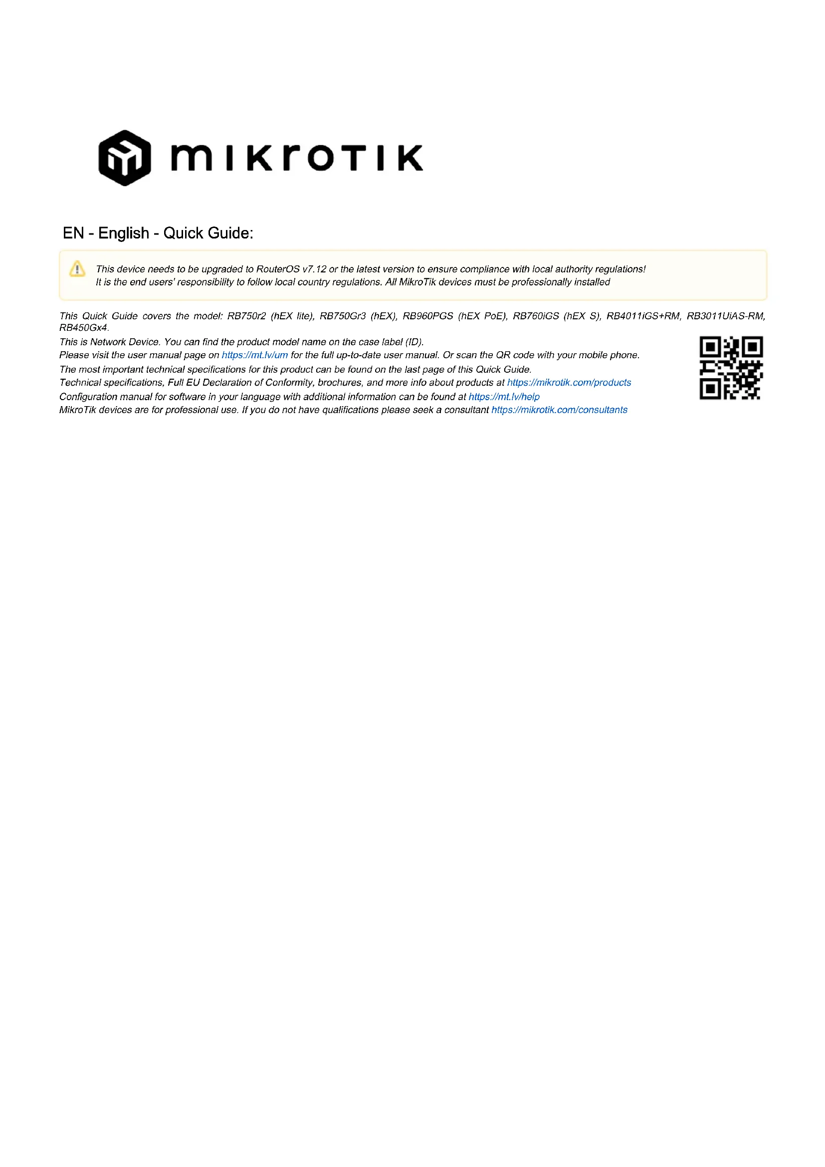 Ceci est un périphérique réseau. Vous pouvez trouver le nom du modèle du produit sur l'étiquette du boîtier (ID). Veuillez visiter la page du manuel d'utilisation sur pour le manuel d'utilisation complet et à jour.https://mt.lv/um-fr Ou scannez le code QR avec votre téléphone portable. Les spécifications techniques les plus importantes de ce produit se trouvent sur la dernière page de ce guide rapide. Spécifications techniques, déclaration de conformité UE complète, brochures et plus d'informations sur les produits sur https://mikrotik.com /products Vous trouverez le manuel de configuration du logiciel dans votre langue avec des informations supplémentaires sur https://mt.lv/help-fr Les appareils MikroTik sont destinés à un usage professionnel. Si vous n'avez pas de qualifications, veuillez consulter un consultant https://mikrotik.com /consultants Premiers pas: Assurez-vous que votre FAI accepte les modifications matérielles et attribuera automatiquement une adresse IP; Connectez le câble du fournisseur d'accès Internet au port Ethernet1; Configurez les paramètres de votre carte réseau pour obtenir automatiquement l'adresse IP via DHCP; Connectez votre PC à n'importe quel port sauf Ethernet1; Connectez l'appareil à une source d'alimentation; La configuration doit être effectuée à l'aide du navigateur Webfig ou de l'outil de configuration WinBoxhttps://mt.lv/winbox; Ouvrezhttp://192.168.88.1 dans un navigateur web pour commencer la configuration. Si l'adresse IP n'est pas disponible, utilisez Winbox et connectez-vous en utilisant l'adresse MAC. Le nom d'utilisateur est "admin", et il n'y a pas de mot de passe (ou, pour certains modèles, vérifiez les mots de passe utilisateur et sans fil sur l'autocollant); Cliquez sur le bouton "Check for updates" et mettez à jour RouterOS vers la dernière version; Pour une mise à jour manuelle de l'appareil, visitez la page des produits sur pour trouver votre produit. Les paquets nécessaires https://mikrotik.com/products sont accessibles sous le menu "Support&Downloads"; Téléchargez les packages téléchargés dans le menu "Files" de Winbox et redémarrez l'appareil; En mettant à jour votre logiciel RouterOS vers la dernière version, vous pouvez garantir des performances optimales, la stabilité et les mises à jour de sécurité; Configurez le mot de passe de votre routeur. Information sur la sécurité: Avant de travailler sur un équipement MikroTik, soyez conscient des dangers liés aux circuits électriques et familiarisez-vous avec les pratiques standard de prévention des accidents.Le programme d'installation doit être familiarisé avec les structures, les termes et les concepts du réseau. Utilisez uniquement l'alimentation et les accessoires approuvés par le fabricant et qui se trouvent dans l'emballage d'origine de ce produit. Cet équipement doit être installé par du personnel formé et qualifié, conformément à ces instructions d'installation.L'installateur est responsable de s'assurer que l'installation de l'équipement est conforme aux codes électriques locaux et nationaux. N'essayez pas de démonter, réparer ou modifier l'appareil. Ce produit est destiné à être installé à l'intérieur.Gardez ce produit loin de l'eau, du feu, de l'humidité ou des environnements chauds. Nous ne pouvons garantir qu'aucun accident ou dommage ne se produira en raison d'une mauvaise utilisation de l'appareil.Veuillez utiliser ce produit avec soin et l'utiliser à vos propres risques! La prise de courant doit être installée à proximité de l'équipement et doit être facilement accessible. En cas de panne de l'appareil, veuillez le déconnecter de l'alimentation.La façon la plus rapide de le faire est de débrancher la fiche d'alimentation de la prise de courant. Pour éviter la contamination de l'environnement, séparez l'appareil des déchets ménagers et éliminez-le de manière sûre, par exemple dans des zones désignées. Familiarisez-vous avec les procédures pour transporter correctement l'équipement vers les points de collecte désignés dans votre région. Il s'agit d'un produit de classe A. Dans un environnement domestique, ce produit peut provoquer des interférences radio, Applicable pour RB750r2 (hEX lite). auquel cas l'utilisateur peut être amené à prendre des mesures adéquates. Fabricant: Mikrotikls SIA, Unijas 2, Riga, Lettonie, LV1039. HR - Hrvatski. Brzi vodič: Ovaj brzi vodič pokriva model: RB750r2 (hEX lite), RB750Gr3 (hEX), RB960PGS (hEX PoE), RB760iGS (hEX S), RB4011iGS+RM, RB3011UiAS-RM, RB450Gx4.