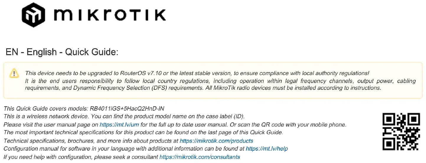 Il s'agit d'un périphérique réseau sans fil. Vous pouvez trouver le nom du modèle du produit sur l'étiquette du boîtier (ID). Veuillez visiter la page du manuel d'utilisation sur pour le manuel d'utilisation complet et à jour.https://mt.lv/um-fr Ou scannez le code QR avec votre téléphone portable. Les spécifications techniques les plus importantes de ce produit se trouvent sur la dernière page de ce guide rapide. Spécifications techniques, brochures et plus d'informations sur les produits surhttps://mikrotik.com/products Vous trouverez le manuel de configuration du logiciel dans votre langue avec des informations supplémentaires sur https://mt.lv/help-fr Si vous avez besoin d'aide pour la configuration, veuillez consulter un consultant https://mikrotik.com/consultants Premiers pas: Assurez-vous que votre fournisseur de services Internet autorise les modifications matérielles et attribue automatiquement une adresse IP; Connectez le câble de votre fournisseur de services Internet au port Ethernet1; Connectez l'appareil à la source d'alimentation; Connectez-vous à l'appareil via l'un des ports, à l'exclusion d'Ethernet1, ou du réseau sans fil "MikroTik-..." (assurez-vous de vérifier les mots de passe sans fil sur l'autocollant); Établir une connexion à l'aide d'une application mobile. Vous pouvez également utiliser Webfig dans un navigateur Web ou l'outil de configuration "WinBox" à l'adresse ;https://mt.lv/winbox Démarrez la configuration dans l'outil choisi en utilisant l'adresse IP par défaut 192.168.88.1. Si l'adresse IP n'est pas disponible, utilisez Winbox et choisissez l'onglet "Neighbors" pour trouver le périphérique; Procédez à la connexion en utilisant l'adresse MAC. Le nom d'utilisateur est "admin", et il n'y a pas de mot de passe (ou, pour certains modèles, vérifiez les mots de passe utilisateur et sans fil sur l'autocollant); Cliquez sur le bouton "Check for updates" et mettez à jour RouterOS vers la dernière version; Pour une mise à jour manuelle de l'appareil, visitez la page des produits sur pour trouver votre produit. Les paquets nécessaires https://mikrotik.com/products sont accessibles dans le menu "Support&Downloads"; Téléchargez les paquets téléchargés dans le menu "Files" de WebFig ou Winbox et redémarrez l'appareil; En mettant à jour votre logiciel RouterOS vers la dernière version, vous pouvez garantir des performances optimales, une stabilité et des mises à jour de sécurité; Dans le menu "QuickSet", configurez ce qui suit : Choisissez votre pays pour appliquer les paramètres de régulation du pays; Configurez le mot de passe de votre réseau sans fil dans le champ de gauche; Configurez le mot de passe de votre routeur dans le champ inférieur. Information sur la sécurité: Cet appareil doit être mis à niveau vers RouterOS v7.10 ou la dernière version stable, pour garantir la conformité aux réglementations des autorités locales! Il est de la responsabilité des utilisateurs finaux de suivre les réglementations locales du pays, y compris le fonctionnement dans les canaux de fréquence légaux, la puissance de sortie, les exigences de câblage et les exigences de sélection dynamique de fréquence (DFS). Tous les appareils radio MikroTik doivent être installés conformément aux instructions.Avant de travailler sur un équipement MikroTik, soyez conscient des dangers liés aux circuits électriques et familiarisez-vous avec les pratiques standard de prévention des accidents. Le programme d'installation doit être familiarisé avec les structures, les termes et les concepts du réseau. Utilisez uniquement l'alimentation et les accessoires approuvés par le fabricant et qui se trouvent dans l'emballage d'origine de ce produit. Cet équipement doit être installé par du personnel formé et qualifié, conformément à ces instructions d'installation. L'installateur est responsable de s'assurer que l'installation de l'équipement est conforme aux codes électriques locaux et nationaux. N'essayez pas de démonter, réparer ou modifier l'appareil. Ce produit est destiné à être installé à l'intérieur. Gardez ce produit loin de l'eau, du feu, de l'humidité ou des environnements chauds. Nous ne pouvons garantir qu'aucun accident ou dommage ne se produira en raison d'une mauvaise utilisation de l'appareil. Veuillez utiliser ce produit avec soin et l'utiliser à vos propres risques! En cas de panne de l'appareil, veuillez le déconnecter de l'alimentation. La façon la plus rapide de le faire est de débrancher l'adaptateur secteur de la prise de courant. Il s'agit d'un produit de classe A. Dans un environnement domestique, ce produit peut provoquer des interférences radio, auquel cas l'utilisateur peut être amené à prendre des mesures adéquates. cet équipement MikroTik est conforme aux limites d'exposition aux rayonnements Union européenne établies pourExposition aux rayonnements radiofréquences: un environnement non contrôlé. Cet appareil MikroTik doit être installé et utilisé à au moins 20 centimètres de votre corps, de l'utilisateur professionnel ou du grand public. Fabricant: Mikrotikls SIA,Unijas 2,Riga, Lettonie, LV1039. HR - Hrvatski. Brzi vodič: Ovaj brzi vodič pokriva modela: RB4011iGS+5HacQ2HnD-IN