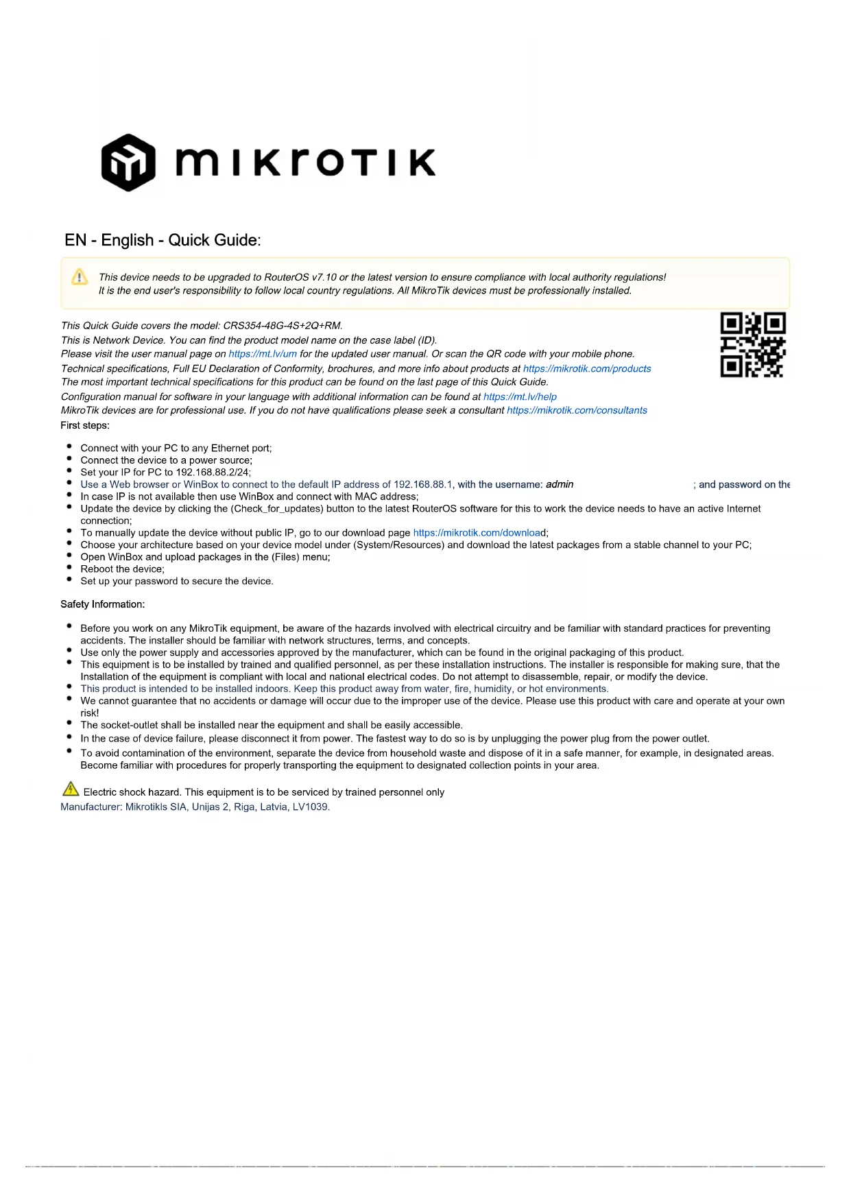 Ceci est un périphérique réseau. Vous pouvez trouver le nom du modèle du produit sur l'étiquette du boîtier (ID). Veuillez visiter la page du manuel d'utilisation sur pour le manuel d'utilisation complet et à jour.https://mt.lv/um-fr Ou scannez le code QR avec votre téléphone portable. Spécifications techniques, déclaration de conformité UE complète, brochures et plus d'informations sur les produits surhttps://mikrotik.com /products Les spécifications techniques les plus importantes de ce produit se trouvent sur la dernière page de ce guide rapide. Vous trouverez le manuel de configuration du logiciel dans votre langue avec des informations supplémentaires sur https://mt.lv/help-fr Les appareils MikroTik sont destinés à un usage professionnel. Si vous n'avez pas de qualifications, veuillez consulter un consultant https://mikrotik.com /consultants Premiers pas: Connectez-vous avec votre PC à n'importe quel port Ethernet; Connectez l'appareil à une source d'alimentation; Réglez votre IP pour PC sur 192.168.88.2/24; Utilisez un navigateur Web ou WinBox pour vous connecter à l'adresse IP par défaut 192.168.88.1, nom d'utilisateur : admin et mot de passe sur l'étiquette ; Dans le cas où l'IP n'est pas disponible, utilisez WinBox et connectez-vous avec l'adresse MAC; Mettez à jour l'appareil en cliquant sur le bouton (Check_for_updates) du dernier logiciel RouterOS pour que cela fonctionne, l'appareil doit avoir une connexion Internet active; Pour mettre à jour manuellement l'appareil sans IP publique, accédez à notre page de téléchargement ;https://mikrotik.com/download Choisissez votre architecture en fonction de votre modèle d'appareil sous (System/Resources) et téléchargez les derniers packages à partir d'un canal stable sur votre PC; Ouvrez WinBox et téléchargez les packages dans le menu (Files); Redémarrez l'appareil; Configurez votre mot de passe pour sécuriser l'appareil. Information sur la sécurité: Tämä laite on päivitettävä RouterOS v7.10 -versioon tai uusimpaan versioon, jotta varmistetaan paikallisviranomaisten määräysten noudattaminen. Loppukäyttäjän vastuulla on noudattaa paikallisia maakohtaisia määräyksiä. Kaikki MikroTik-laitteet on asennettava ammattimaisesti. Cet appareil doit être mis à niveau vers RouterOS v7.10 ou la dernière version pour garantir la conformité aux réglementations des autorités locales. Il est de la responsabilité des utilisateurs finaux de suivre les réglementations locales du pays