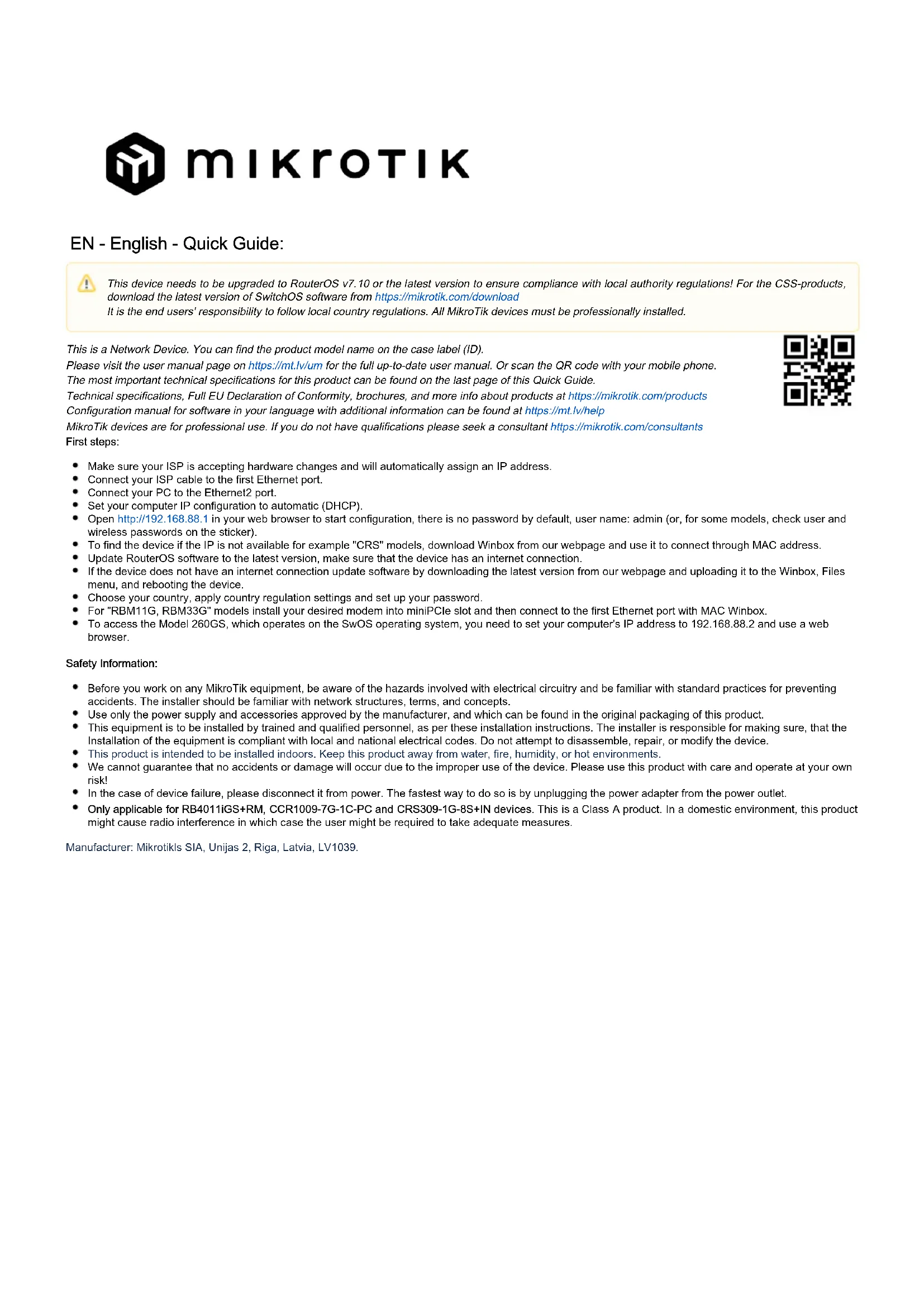 Ceci est un périphérique réseau. Vous pouvez trouver le nom du modèle du produit sur l'étiquette du boîtier (ID). Veuillez visiter la page du manuel d'utilisation sur pour le manuel d'utilisation complet et à jour.https://mt.lv/um-fr Ou scannez le code QR avec votre téléphone portable. Les spécifications techniques les plus importantes de ce produit se trouvent sur la dernière page de ce guide rapide. Spécifications techniques, déclaration de conformité UE complète, brochures et plus d'informations sur les produits surhttps://mikrotik.com /products Vous trouverez le manuel de configuration du logiciel dans votre langue avec des informations supplémentaires sur https://mt.lv/help-fr Les appareils MikroTik sont destinés à un usage professionnel. Si vous n'avez pas de qualifications, veuillez consulter un consultant https://mikrotik.com /consultants Premiers pas: Assurez-vous que votre FAI accepte les modifications matérielles et attribuera automatiquement une adresse IP. Connectez votre câble ISP au premier port Ethernet. Connectez votre PC au port Ethernet2. Définissez la configuration IP de votre ordinateur sur automatique (DHCP). Ouvrez dans votre navigateur Web pour démarrer la configuration, il n'y a pas de mot de passe par défaut, nom d'utilisateur: admin (ou, http://192.168.88.1 pour certains modèles, vérifiez les mots de passe utilisateur et sans fil sur l'autocollant). Pour trouver l'appareil si l'IP n'est pas disponible, par exemple les modèles "CRS", téléchargez Winbox à partir de notre page Web et utilisez-le pour vous connecter via l'adresse MAC. Mettez à jour le logiciel RouterOS vers la dernière version, assurez-vous que l'appareil dispose d'une connexion Internet. Si l'appareil ne dispose pas d'un logiciel de mise à jour de la connexion Internet, téléchargez la dernière version de notre page Web et téléchargez-la dans le menu Winbox, Fichiers et redémarrez l'appareil. Choisissez votre pays, pour appliquer les paramètres de réglementation du pays et configurer votre mot de passe. Pour lesmodèles "RBM11G, RBM33G", installez le modem souhaité dans l'emplacement miniPCIe, puis connectez-vous au premier port Ethernet avec MAC Winbox. Pour accéder au modèle 260GS, qui fonctionne sur le système d'exploitation SwOS, vous devez définir l'adresse IP de votre ordinateur sur 192.168.88.2 et utiliser un navigateur Web. Information sur la sécurité: Tämä laite on päivitettävä RouterOS v7.10 -versioon tai uusimpaan versioon, jotta varmistetaan paikallisviranomaisten määräysten noudattaminen. Lataa CSS-tuotteita varten SwitchOS-ohjelmiston uusin versio osoitteestahttps://mikrotik.com/download Loppukäyttäjien vastuulla on noudattaa paikallisia maalakeja