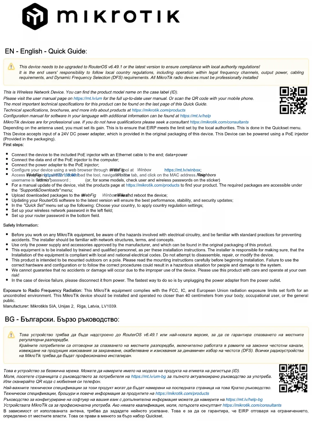 les exigences d'alimentation, de câblage et de sélection dynamique de fréquence (DFS). Tous les appareils radio MikroTik doivent êtreinstallé professionnellement.Avant de travailler sur un équipement MikroTik, soyez conscient des dangers liés aux circuits électriques et familiarisez-vous avec les pratiques standard de prévention des accidents. Le programme d'installation doit être familiarisé avec les structures, les termes et les concepts du réseau. Utilisez uniquementl'alimentation et accessoires approuvés par le fabricant, etquipeuvent être a trouvé dansl'emballage d'origine de ce produit. Cet équipement doit être installé par du personnel formé et qualifié, conformément à ces instructions d'installation. L'installateur est responsable de s'assurer que l'installation de l'équipement est conforme aux codes électriques locaux et nationaux. N'essayez pas de démonter, réparer ou modifier l'appareil. Ce produit est destiné à être monté à l'extérieur sur un poteau. Veuillez lire attentivement les instructions de montage avant de commencer l'installation. Le fait de ne pas utiliser lematériel et la configuration corrects ou de ne pas suivre les procédures correctes peut entraîner une situation dangereuse pour les .personnes et endommager le système Nous ne pouvons garantir qu'aucun accident ou dommage ne se produira en raison d'une mauvaise utilisation de l'appareil. Veuillez utiliser ce produit avec soin et l'utiliser à vos propres risques! En cas de panne de l'appareil, veuillez le déconnecter de l'alimentation. La façon la plus rapide de le faire est de débrancher l'adaptateur secteur de la prise de courant. cet équipement MikroTik est conforme aux limites d'exposition aux rayonnements FCC, IC et Union européenneExposition aux rayonnements radiofréquences: établies pour un environnement non contrôlé. Cet appareil MikroTik doit être installé et utilisé à au moins 40 centimètres de votre corps, de l'utilisateur professionnel ou du grand public. Fabricant: Mikrotikls SIA, Unijas 2, Riga, Lettonie, LV1039. HR - Hrvatski. Brzi vodič: