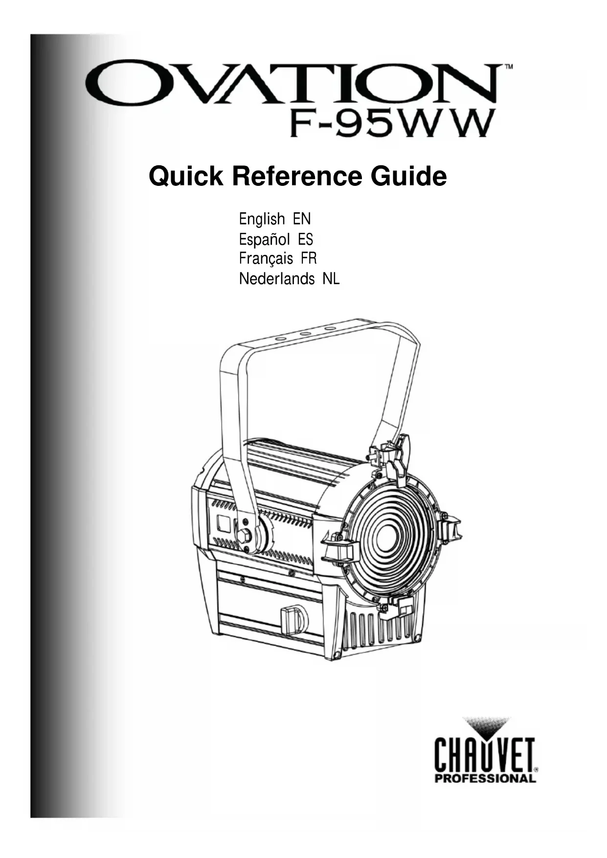 Le Manuel de Référence Ovation™ F-95WW Quick Reference Guide (MR) reprend des informations de base sur ce produit notamment en matière de connexions, montage, options de menu et valeurs DMX. Téléchargez le manuel d'utilisation sur www.chauvetprofessional.com pour d e plus amples informations.