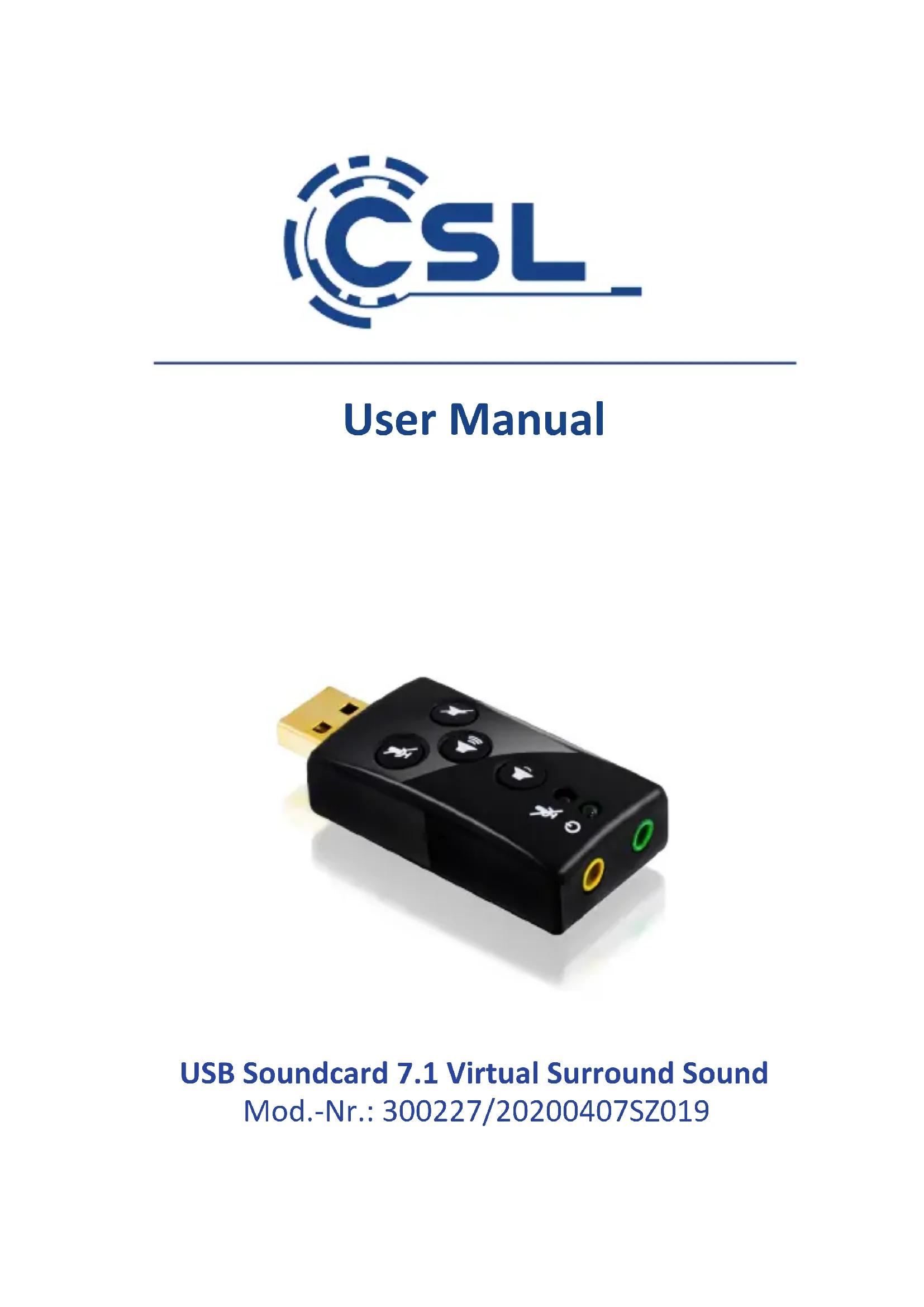 Sortez la carte son USB de l'emballage et connectez-la à un port USB libre de votre ordinateur. Grâce à « Plug and Play », vous pouvez le faire aussi durant le fonc- onnement. L'installaon du pilote de disposif s'eectue automaquement. Pour uliser la foncon de son surround, suivez les instrucons suivantes.