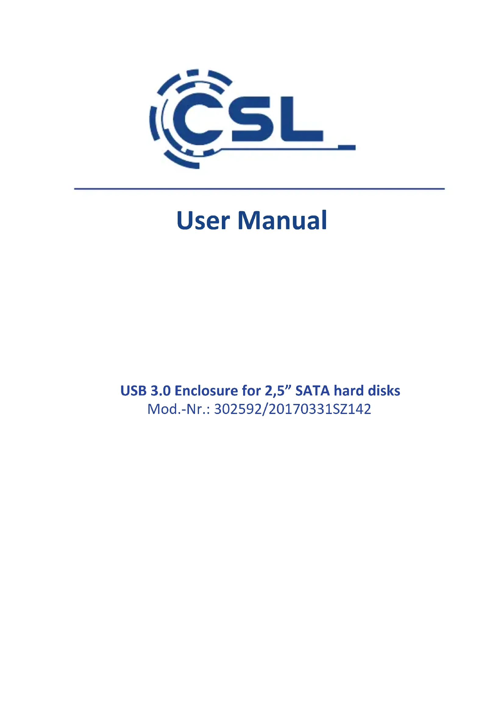 - sans vis13Français Aenon! 4 Consignes de sécurité et clause de non responsabilité Veuillez ne pas essayer de réparer ou de modier le boîer pour disques durs vous-même. Évitez tout contact avec la tension du secteur. Le boîer pour disques durs est hors tension uniquement lorsque la che est rerée. Eectuez une mise à la terre base avant de manipuler un élément électronique. Cela protège votre corps de dommages causés par des décharges électrostaques. Les décharges électrostaques peuvent endommager de manière irréversible votre carte enchable ainsi que l’ensemble des composants informaques reliés entre eux !Vous eectuez la mise en place du disque dur à vos risques et périls. Laissez des professionnels eectuer le montage, si vous ne disposez d’aucune connaissance praque et technique dans le domaine de l’informaque ou de l’électrotechnique. Le fabricant décline toute responsabilité pour des dommages ou des séquelles à la suite d’une installaon ou d’une ulisaon inappropriée. L’obligaon de sauvegarde des données incombe exclusivement au client. Le boîer pour disque dur n’est pas approuvé pour une ulisaon en extérieur. Pour cee raison, ulisez-le uniquement dans un endroit sec. Protégez-le d’un taux d’humidité élevé, de l’eau et de la neige. N’exposez pas l’appareil à des tempéra- tures élevées. N’exposez pas l’appareil à des changements de température soudains ou à de fortes vibraons, car cela pourrait endommager les éléments électroniques. Véri- ez que l’appareil n’est pas endommagé avant de l’uliser. Ne pas uliser l’appa- reil s’il a subi un choc ou qu’il a été endommagé d’une quelconque autre manière. Veillez à également respecter les disposions et les restricons naonales. N’ulisez pas l’appareil dans un autre but que celui indiqué dans les présentes instrucons. Cet appareil n’est pas un jouet. Conservez-le hors de portée des enfants ou des personnes aeintes de troubles mentaux. Toute modicaon ou14 Français Direcve DEEE: 2012/19/EU EUN° d’enregistrement DEE: 94495668 Par la présente, la société WD Plus GmbH déclare que l’appareil 302592/20170331SZ142 est conforme aux exigences essenelles et aux autres disposions pernentes. Pour obte- nir une déclaraon de conformité dans son intégralité, contactez: WD Plus GmbH, Wohlen- bergstraße 16, 30179 Hanovre réparaon qui n’a pas été eectuée par le fournisseur d’origine entraîne l’annu- laon de la garane et des droits de recours en garane.Les spécicaons de l’appareil peuvent être modiées sans nocaon préalable. 5 Indicaons de recyclage Les appareils électriques et électroniques ne doivent pas être jetés avec les or- dures ménagères, conformément à la direcve DEEE. Leurs éléments doivent être recyclés ou éliminés séparément, car une éliminaon inappropriée d’éléments toxiques et dangereux pourrait porter préjudice à l’environnement. Conformément à la loi relave aux appareils électroniques, en tant que consom- mateur, vous êtes obligé de ramener gratuitement les appareils électriques et électroniques arrivés en n de vie au fabricant, au point de vente ou dans un point de collecte prévu à cet eet. La loi de chaque pays règle les détails connexes. Le symbole sur le produit, le manuel d’ulisaon et/ou l’emballage indique lesdites disposions. Avec ce type de séparaon des maères, de recyclage et d’éliminaon des appareils usagés, vous prenez part acvement à la protecon de notre environnement.15Español Muchas gracias por haberse decidido por un producto de CSL. Para que pueda disfrutar durante mucho empo del disposivo adquirido, le recomendamos que lea atentamente las siguientes instrucciones. 1 Volumen de suministro