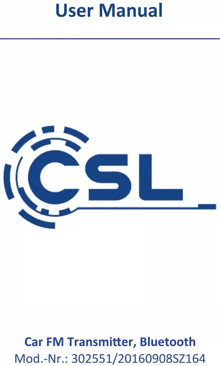 - Aux IN Bande de fréquences d'émission 87.5 - 108 MHz11Français 5 Autres possibilités de connexion Si vous ne souhaitez pas uliser l'émeeur FM avec la foncon Bluetooth, vous pouvez - le cas échéant - uliser la foncon Carte microSD ou la prise de connexion Jack de 3,5 mm pour transférer la musique sur la radio. 6 Mise en service Rerez le disposif de l'emballage. Branchez l'adaptateur de courant de voiture dans la prise de charge de voiture. Réglez la même fréquence sur votre radio et l'émeeur FM. Pour régler la fréquence sur l'émeeur, appuyez brièvement une fois sur la touche « CH ». La fréquence à l'écran commence à clignoter. Ulisez les touches « Suivant » et « Retour » sur le côté de l'appareil pour régler la fréquence à votre guise. Recherchez le nom du Bluetooth « CSL-302551 » et connectez l'émeeur FM de voiture via Bluetooth à l'équipement Bluetooth de votre choix Smart- phone ou lecteur MP3). Alternavement, vous pouvez insérer une carte microSD ou brancher un appareil via le câble Jack de 3,5 mm. Finalement, il est très facile d'écouter la musique en cours de lecture sur votre radio. Le bouton « Play/Pause » se trouve à l'avant de l'émeeur FM à côté de la touche « CH ». Remarque : An de garanr une qualité sonore opmale, nous vous recomman- dons régler le niveau de volume de votre disposif à 20 ou plus haut. 7 Adaptateur de courant de voiture L'adaptateur de courant de voiture est connecté sur une prise de charge de 12 V et peut à cet eet être ulisé pour charger un Smartphone en branchant un câble de charge via le port USB.12 Français Aenon! 8 Consignes de sécurité et clause de non responsabilité N’essayez jamais d’ouvrir l’appareil pour le réparer ou le modier. Évitez tout con- tact avec la tension du secteur. Ne court-circuitez pas l’appareil. L’appareil n’est pas approuvé pour une ulisaon en extérieur, ulisez-le exclusivement dans un endroit sec. Protégez-le d’un taux d’humidité élevé, de l’eau et de la neige. N’ex- posez pas l’appareil à des températures élevées. N’exposez pas l’appareil à des changements de température soudains ou à de fortes vibraons, car cela pourrait endommager les éléments électroniques. Vériez que l’appareil n’est pas endom- magé avant de l’uliser. Ne pas uliser l’appareil s’il a subi un choc ou qu’il a été endommagé d’une quelconque autre manière. Veillez à respecter les disposions et les restricons naonales. N’ulisez pas l’appareil dans un autre but que celui indiqué dans les instrucons.Cet appareil n’est pas un jouet. Conservez-le hors de portée des enfants ou des personnes aeintes de troubles mentaux.Toute modi- caon ou réparaon qui n’a pas été eectuée par le fournisseur d’origine entraîne l’annulaon de la garane et des droits de recours en garane.L’ulisaon de l’ap- pareil est réservée aux personnes qui ont lu et compris les présentes instrucons. Les spécicaons de l’appareil peuvent être modiées sans nocaon préalable.13Français Direcve DEEE: 2012/19/EU N° d’enregistrement DE: 94495668 Par la présente, la société CSL Computer GmbH & Co. KG déclare que l’appareil 302551/20160908SZ164 est conforme aux exigences essenelles et aux autres disposions pernentes de la Direcve 1999/5/CE. Pour obtenir une déclaraon de conformité dans son intégralité, contactez: CSL Computer GmbH & Co. KG, Sokelantstraße 35, 30165 Hanovre 9 Indicaons de recyclage Les appareils électriques et électroniques ne doivent pas être jetés avec les ordu- res ménagères, conformément à la direcve DEEE. Leurs éléments doivent être recyclés ou éliminés séparément, car une éliminaon inappropriée d’éléments to- xiques et dangereux pourrait porter préjudice à l’environnement. Conformément à la loi relave aux appareils électroniques, en tant que consommateur, vous êtes obligé de ramener gratuitement les appareils électriques et électroniques arrivés en n de vie au fabricant, au point de vente ou dans un point de collecte prévu à cet eet. La loi de chaque pays règle les détails connexes. Le symbole sur le produit, le manuel d’ulisaon et/ou l’emballage indique lesdites disposions. Avec ce type de séparaon des maères, de recyclage et d’éliminaon des appareils usagés, vous prenez part acvement à la protecon de notre environnement.14 Italiano Grazie per aver scelto un prodoo di CSL. Per ulizzare con soddisfazione il dis- posivo acquistato, si prega di leggere aentamente le seguen brevi istruzioni per l’uso. 1 Contenuto della confezione