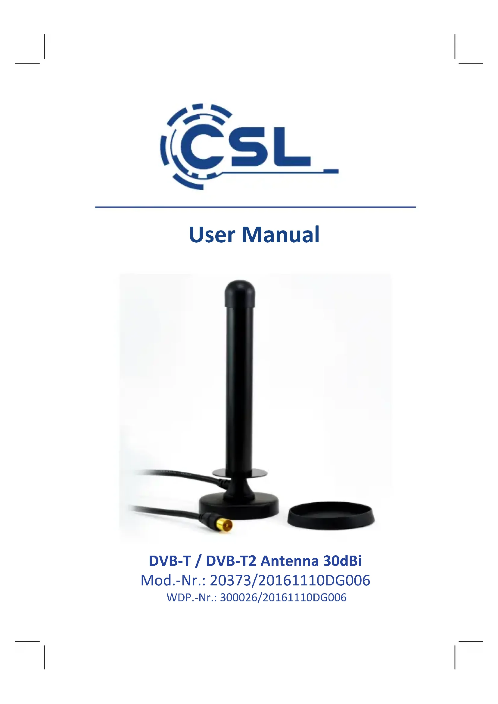 - Guide de démarrage rapide 2 Spécicaons techniques 3 Détails du produit Longueur du câble environ 1,5 m Connexion Fiche coaxiale Caractérisque Base magnéque Antenne Fiche coaxiale Base10 Français 4 Note complémentaire Si peu ou pas de chaînes ont été trouvées durant la recherche, cela est proba- blement dû à l’orientaon de l’antenne. Vériez si le câble de connexion est connecté à la antenne DVB-T / DVB-T2, modiez la posion de l’antenne et exécu- tez une nouvelle recherche. Assurez-vous qu’aucun appareil pouvant masquer le signal DVB-T / DVB-T2 ne se trouve à proximité directe de l’antenne. Sur internet existent diérentes pages web, lesquelles indiquent á vous l´intensité du signal DVB-T / DVB-T2 dans votre région. Veuillez vérier s´il vous plaît sur la page web respecf. Si vous avez des quesons, s´il vous plaît n´hésitez pas á contacter notre service clientèle pour de renseignements. 5 Consignes de sécurité et clause de non responsabilité N’essayez jamais d’ouvrir l’appareil pour le réparer ou le modier. Évitez tout contact avec la tension du secteur. Ne court-circuitez pas l’appareil. L’appareil n’est pas étanche, veuillez l’uliser uniquement dans un endroit sec. Protégez-le d’un taux d’humidité élevé, de l’eau et de la neige. N’exposez pas l’appareil à des tem- pératures élevées. N’exposez pas l’appareil à des changements de température soudains ou à de fortes vibraons, car cela pourrait endommager les éléments électroniques. Vériez que l’appareil n’est pas endommagé avant de l’uliser Ne pas uliser l’appareil s’il a subi un choc ou qu’il a été endommagé d’une quel- conque autre manière. Veillez à respecter les disposions et les restricons nao- nales. N’ulisez pas l’appareil dans un autre but que celui indiqué dans les instruc- ons. Cet appareil n’est pas un jouet. Conservez-le hors de portée des enfants ou des personnes aeintes de troubles mentaux. Toute modicaon ou réparaon qui n’a pas été eectuée par le fournisseur d’origine entraîne l’annulaon de la garane et des droits de recours en garane. L’ulisaon de l’appareil est réservée aux personnes qui ont lu et compris les présentes instrucons. Les spécicaons de l’appareil peuvent être modiées sans nocaon préalable.11 Français Direcve DEEE: 2012/19/EU EUN° d’enregistrement DEE: 94495668 Par la présente, la société CSL Computer GmbH & Co. KG déclare que l’appareil 20373/20161110DG006 est conforme aux exigences essenelles et aux autres disposions pernentes. Pour obtenir une déclaraon de conformité dans son intégralité, contactez: CSL Computer GmbH & Co. KG, Sokelantstraße 35, 30165 Hanovre 6 Indicaons de recyclage Les appareils électriques et électroniques ne doivent pas être jetés avec les or- dures ménagères, conformément à la direcve DEEE. Leurs éléments doivent être recyclés ou éliminés séparément, car une éliminaon inappropriée d’éléments toxiques et dangereux pourrait porter préjudice à l’environnement. Conformé- ment à la loi relave aux appareils électroniques, en tant que consommateur, vous êtes obligé de ramener gratuitement les appareils électriques et électro- niques arrivés en n de vie au fabricant, au point de vente ou dans un point de collecte prévu à cet eet. La loi de chaque pays règle les détails connexes. Le symbole sur le produit, le manuel d’ulisaon et/ou l’emballage indique lesdites disposions. Avec ce type de séparaon des maères, de recyclage et d’élimina- on des appareils usagés, vous prenez part acvement à la protecon de notre environnement.12 Italiano Grazie per aver scelto un prodoo di CSL. Per usufruire a lungo dell’apparecchio appena acquistato, leggere aentamente la guida rapida di riferimento che segue. 1 Confezione
