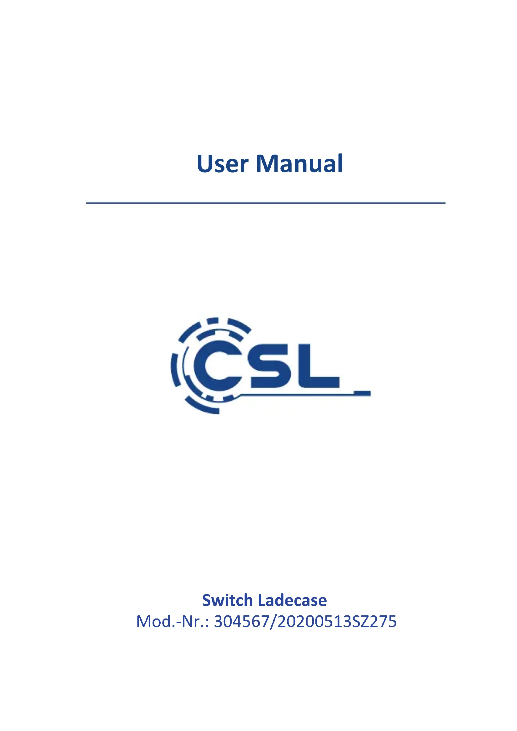En relaon avec la vente de baeries ou de la livraison d'appareils contenants des baeries, le fournisseur est obligé d'informer le client sur les points suivants : Le Client est légalement tenu, en tant qu'ulisateur nal, de restuer les baeries usagées. Il peut retourner gratuitement à l'entrepôt d'expédion (adresse d'ex- pédion) du fournisseur des baeries usagées que le fournisseur ore ou a oert comme piles neuves dans son assorment. Les symboles gurant sur les baeries ont les signicaons suivantes : Pb = la baerie conent plus de 0,004 % en poids de plomb, Cd = la baerie conent plus de 0,002 % en poids de cadmium, Hg = la baerie conent plus de 0,0005 % en poids de mercure. Par la présente, WD Plus GmbH déclare que l'appareil 304567/20200513SZ275 est conforme aux exigences essenelles et aux autres disposions pernentes de la direcve. Pour obtenir une déclaraon de conformité complète, adressez-vous à : WD Plus GmbH, Wohlenbergstraße 16,30179 Hanovre Direcve DEEE : 2012/19/UE Numéro de registre DEEE : DE 67896761 Le symbole de la poubelle barrée signie que la baerie ne doit pas être éliminée avec les ordures ménagères.18 Italiano Grazie per aver scelto un prodoo di CSL. Per ulizzare con soddisfazione l'appa- recchio acquistato, si prega di leggere aentamente le seguen brevi istruzioni per l’uso. Prima della messa in funzione della merce consegnata, vericare che sia in- tegra, esente da dife e non danneggiata.
