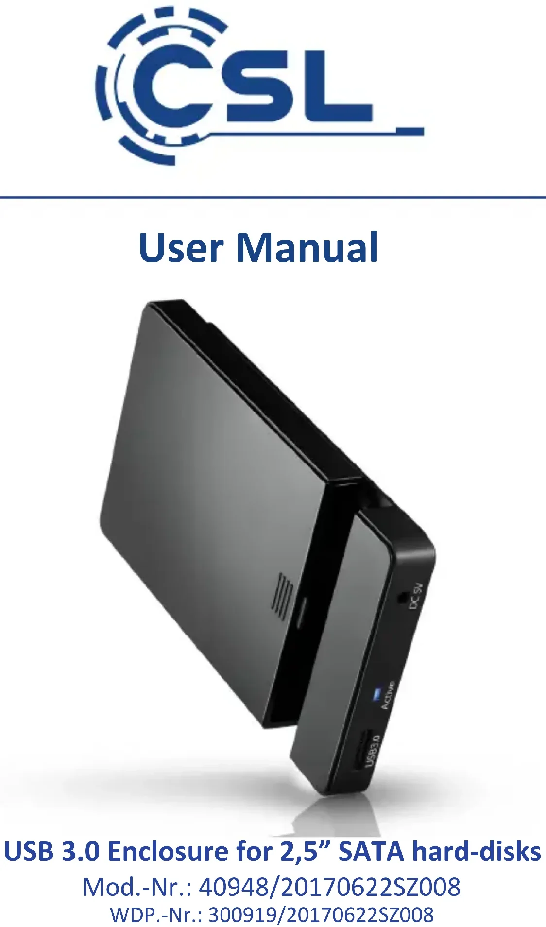 - MacOS 10.4.5 ou supérieurr13Français 4 Consignes de sécurité et clause de non responsabilité Veuillez ne pas essayer de réparer ou de modier le boîer pour disques durs vous-même. Évitez tout contact avec la tension du secteur. Le boîer pour disques durs est hors tension uniquement lorsque la che est rerée. Eectuez une mise à la terre base avant de manipuler un élément électronique. Cela protège votre corps de dommages causés par des décharges électrostaques. Les décharges électrostaques peuvent endommager de manière irréversible votre carte enchable ainsi que l’ensemble des composants informaques reliés entre eux !Vous eectuez la mise en place du disque dur à vos risques et périls. Laissez des professionnels eectuer le montage, si vous ne disposez d’aucune connaissance praque et technique dans le domaine de l’informaque ou de l’électrotechnique. Le fabricant décline toute responsabilité pour des dommages ou des séquelles à la suite d’une installaon ou d’une ulisaon inappropriée. L’obligaon de sauvegarde des données incombe exclusivement au client. Le boîer pour disque dur n’est pas approuvé pour une ulisaon en extérieur. Pour cee raison, ulisez-le uniquement dans un endroit sec. Protégez-le d’un taux d’humidité élevé, de l’eau et de la neige. N’exposez pas l’appareil à des tempéra- tures élevées. N’exposez pas l’appareil à des changements de température soudains ou à de fortes vibraons, car cela pourrait endommager les éléments électroniques. Véri- ez que l’appareil n’est pas endommagé avant de l’uliser. Ne pas uliser l’appa- reil s’il a subi un choc ou qu’il a été endommagé d’une quelconque autre manière. Veillez à également respecter les disposions et les restricons naonales. N’ulisez pas l’appareil dans un autre but que celui indiqué dans les présentes instrucons. Cet appareil n’est pas un jouet. Conservez-le hors de portée des enfants ou des personnes aeintes de troubles mentaux. Toute modicaon ou réparaon qui n’a pas été eectuée par le fournisseur d’origine entraîne l’annu- laon de la garane et des droits de recours en garane.Les spécicaons de l’appareil peuvent être modiées sans nocaon préalable.14 Français Direcve DEEE: 2012/19/EU EUN° d’enregistrement DEE: 67896761 Par la présente, la société WD Plus GmbH, déclare que l’appareil 40948/20170622SZ008 est conforme aux exigences essenelles et aux autres disposions pernentes. Pour ob- tenir une déclaraon de conformité dans son intégralité, contactez: WD Plus GmbH, Wohlenbergstraße 16, 30179 Hanovre 5 Indicaons de recyclage Les appareils électriques et électroniques ne doivent pas être jetés avec les or- dures ménagères, conformément à la direcve DEEE. Leurs éléments doivent être recyclés ou éliminés séparément, car une éliminaon inappropriée d’éléments toxiques et dangereux pourrait porter préjudice à l’environnement. Conformément à la loi relave aux appareils électroniques, en tant que consom- mateur, vous êtes obligé de ramener gratuitement les appareils électriques et électroniques arrivés en n de vie au fabricant, au point de vente ou dans un point de collecte prévu à cet eet. La loi de chaque pays règle les détails connexes. Le symbole sur le produit, le manuel d’ulisaon et/ou l’emballage indique lesdites disposions. Avec ce type de séparaon des maères, de recyclage et d’éliminaon des appareils usagés, vous prenez part acvement à la protecon de notre environnement.15Español Muchas gracias por haberse decidido por un producto de CSL. Para que pueda disfrutar durante mucho empo del disposivo adquirido, le recomendamos que lea atentamente las siguientes instrucciones. 1 Volumen de suministro