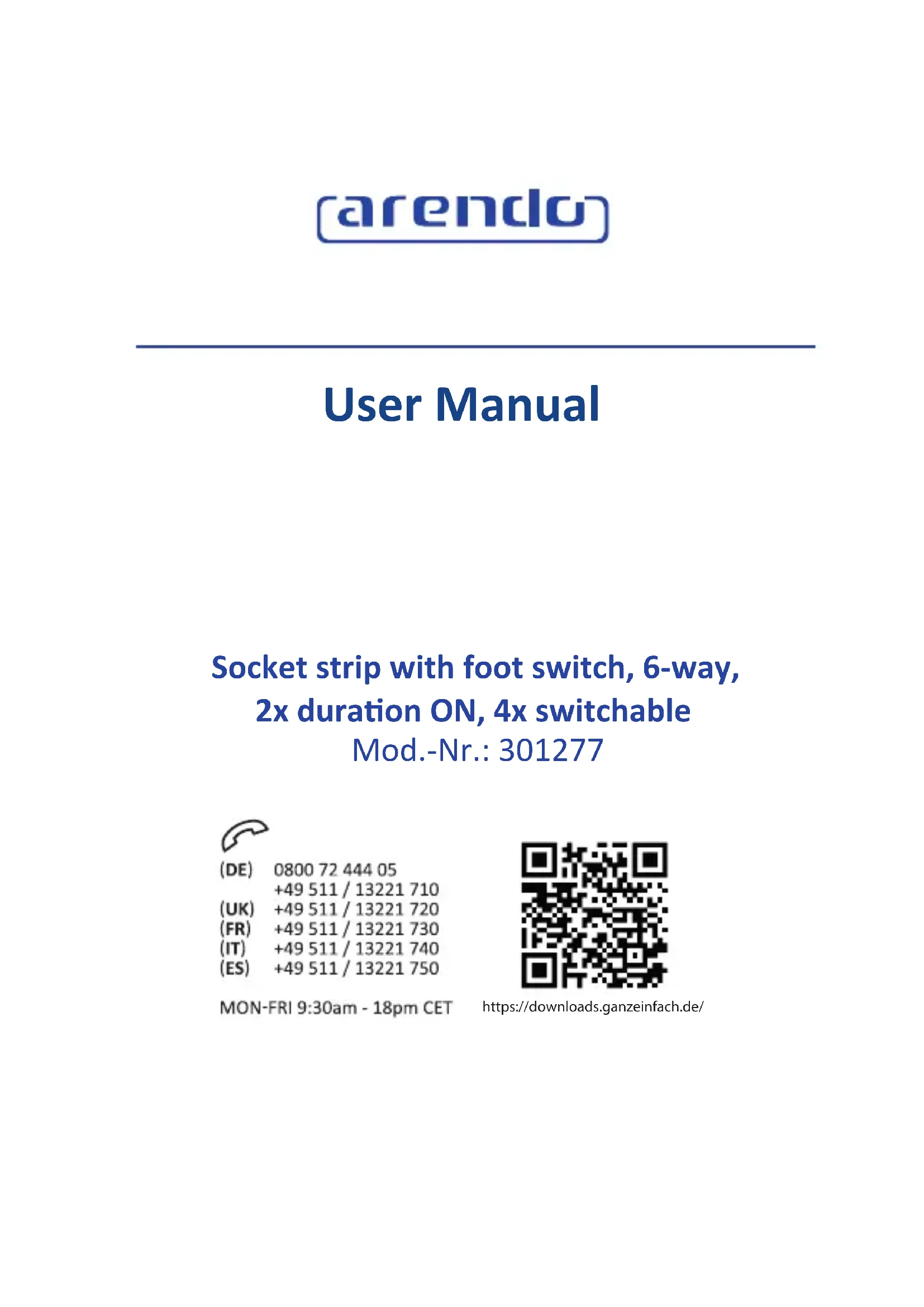 Sortez le produit de l’emballage et rerez tout matériau d’emballage. Branchez la mulprise à une prise correctement installée chez vous. Le disposif est mainte- nant opéraonnel. La mulprise comporte six prises en tout, dont quatre s’allu- ment et s’éteignent tout simplement avec le commutateur à pied. Les deux premières prises sont constamment alimentées en courant et sont indi- quées par le marquage « Permanent ». L’achage « ON/OFF » sur le commutateur à pied indique si les quatre prises commutables sont allumées ou éteintes. Si la LED est allumée, tous les appareils raccordés aux quatre prises sont alimentés en courant.